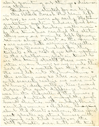 12 about, pointing out things & discussing them. Friday we started for our trip in the Black Forest. The train left at 7:15, so we were up early. The transportation system, however, had been disturbed by a broken water main & by the time we reached the station there was one minute left. German trains always start on the minute & are never late arriving. Nevertheless Dr. Downey rushed for the tickets & the rest of us tore upstairs to the platform, just in time to see the train start! There was another in an hour, so we made the best of it & waited for that one. The way led into the mountains & the scenery was so like our own, we could scarcely realize we were not at home: deep valleys, tree-covered slopes. The great difference, however, was in the character of the houses & villages. Instead of unsightly, rough board shanties with unkempt men & untidy women & children lounging about the streets & saloons, there were neat plaster or stone houses with sloping red-tiled roofs, or the still quainter ones, built with turf