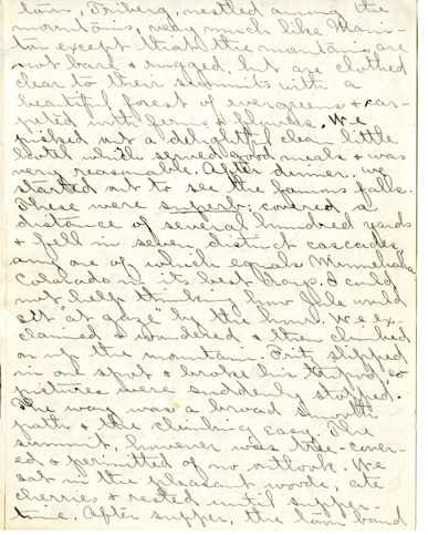 15 town, Triberg , nestled among the mountains, very much like Mariton except that the mountains are not bare and rugged, but are clothed clear to their summits with a beautiful forest of evergreens & carpeted with ferns & flowers. We picked out a delightful clean little hotel which served good meals & was very reasonable. After dinner, we started out to see the famous falls. These were superb ; covered a distance of several hundred yards & fell in seven distinct cascades, any one of which equals Minnehaha Colorado in its best days. I could not help thinking how Jule would sit “at gaze” by the hour. We exclaimed & wondered & then climbed on up the mountain. Fritz slipped in one spot & broke his tripod, so pictures were suddenly stopped. The way was a broad smooth path & the climbing easy. The summit, however was tree-covered & permitted of no outlook. We sat in the pleasant woods, ate cherries & rested until supper-time. After supper, the town band