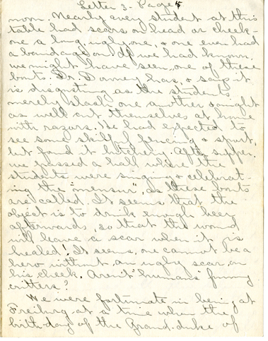 17 noon. Nearly every student at this table had scars on head or cheek — one a large, ugly one, & one even had a bandage on. If we had known we might have seen one of these bouts. Dr. Downey has, & says it is disgusting as the students merely slash one another & might as well cut themselves at home with razors. He had expected to see some skillful fencing & sport, but found it butchery. After supper we passed a hall where the students were singing & celebrating the “ mensur “, as these bouts are called. It seems that the object is to drink enough beer afterwards, so that the wound will leave a scar when it is healed! It seems, one cannot be a hero without an ugly scar on his cheek. Aren’t “humans” funny critters? We were fortunate in being at Freiburg at a time when the birth-day ? of the Grand-duke of