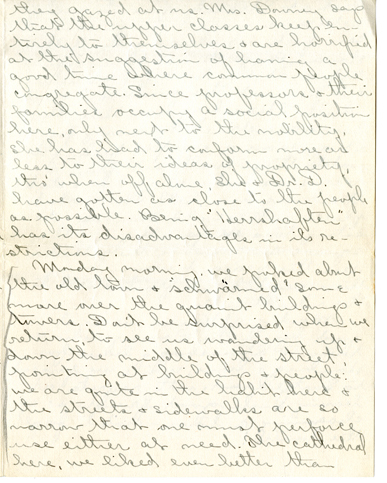 19 they gazed at us. Mrs. Downey says that the upper classes keep entirely to themselves & are horrified at the suggestion of having a good time where common people congregate. Since professors & their families occupy a social position here, only next to the nobility, she has had to conform more or less to their ideas of propriety, tho’ when all alone, she & Dr. D. have gotten as close to the people as possible. Being “Herrshaften” has its disadvantages in its restrictions. Monday morning we poked about the old town & “schwärmed” some more over the granite buildings & towers. Don’t be surprised when we return to see us wandering up & down the middle of the street, pointing at buildings & people: we are quite in the habit here & the streets & sidewalks are so narrow that one must perforce use either at need. The cathedral here, we liked even better than