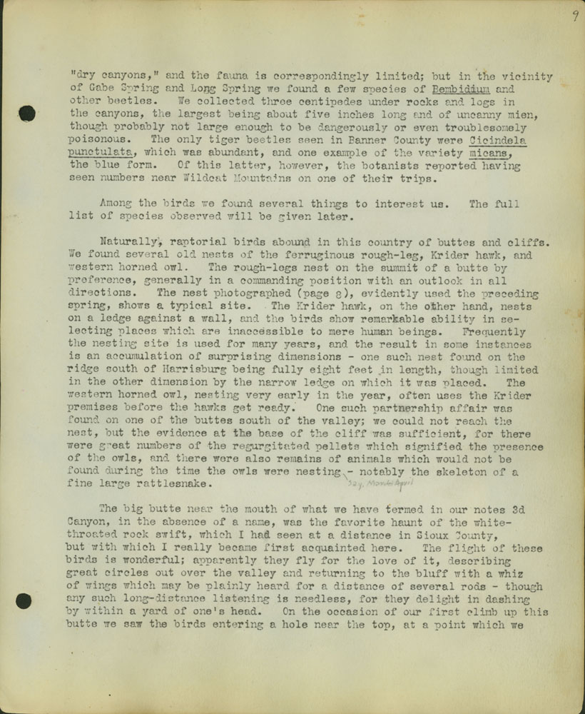 9 “dry canyons,” and the fauna is correspondingly limited; but in the vincinity of Gabe Spring and Long Spring we found a few species of Bembidium and other beetles. We collected three centipedes under rocks and logs in the canyons, the largest being about five inches long and of uncanny mien, though probably not large enough to be dangerously or even troublesomely poisonous. The only tiger beetles seen in Banner County were Cicindela punctulata , which was abundant, and one example of the variety micans, the blue form. Of this latter, however, the botanists reported having seen numbers near Wildcat Mountains on one of their trips. Among the birds we found several things to interest us. The full list of species observed will be given later. Naturally, raptorial birds abound in this country of buttes and cliffs. We found several old nests of the ferruginous rough-legs nest on the summit of a butte by preference, generally in a commanding position with an outlook in all directions. The nest photographed (page 8), evidently used the preceding spring, shows a typical site. The Krider Hawk, on the other hand, nests on a ledge against a wall, and the birds show remarkable ability in selecting places which are inaccessible to mere human beings. Frequently the nesting site is used for many years, and the result in some instances is an accumlation of surprising dimensions – one such nest found on the ridge south of Harrisburg being fully eight feet in length, though limited in the other dimension by the narrow ledge on which it was placed. The western horned owl, nesting very early in the year, often uses the Krider premises before the hawks get ready. One such partnershup affiar was found on one of the buttes south of the valley; we could not reach the nest, but the evidence at the base of the cliff was sufficient, for there were great numbers of the regurgitated pellets which signified the presence of the owls, and there were also remains of animals which would not be found during the time the owls were nesting – notably the skeleton of a fine large rattlesnake. The big butte near the mouth of what we have termed in our notes 3d Canyon, in the absence of a name, was the favorite haunt of the white-throated rock swift, which I had seen at a distance in Sioux County , but with which I really became first acquainted here. The flight of these birds is wonderful; apparently they fly for the love of it, describing great circles out over the valley and returning to the bluff with a whiz of wings which may be plainly heard for a distance of several rods – though any such long-distance listening is needless, for they delight in dashing by within a yard of one’s head. On the occasion of our first climb up this butte we saw the birds entering a hole near the top, at a point which