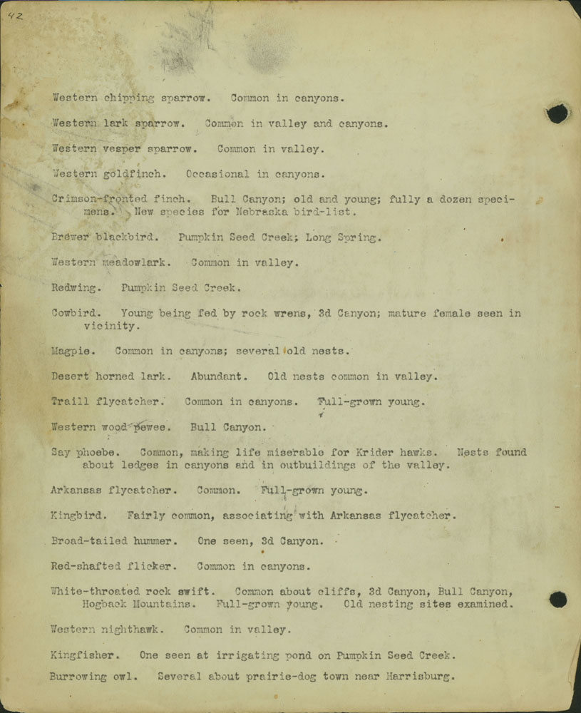 42 • Western chipping sparrow. Common in canyons.; Western lark sparrow. Common in valley and canyons.; Western vesper sparrow. Common in valley.; Western goldfinch. Occasional in canyons.; Crimson-fronted finch. Bull Canyon; old and young; fully a dozen specimens. New species for Nebraska bird-list.; Brewer blackbird. Pumpkin Seed Creek; Long Spring.; Western meadowlark. Common in valley.; Redwing. Pumpkin Seed Creek.; Cowbird. Young being fed by rock wrens, 3d Canyon; mature female seen in vicinity.; Magpie. Common in canyons; several old nests.; Desert horned lark. Abundant. Old nests common in valley.; Trail flycatcher. Common in canyons. Full-grown young.; Western wood pewee. Bull Canyon.; Say phoebe. Common, making life miserable for Krider hawks. Nests found about ledges in canyons and in outbuildings of the valley.; Arkansas flycatcher. Common. Full-grown young.; Kingbird. Fairly common, associating with Arkansas flycatcher.; Broad-tailed hummer. One seen, 3d Canyon.; Red-shafted flicker. Common in canyons.; White-throated rock swift. Common about cliffs, 3d Canyon, Bull Canyon, Hogback Mountains. Full-grown young. Old nesting sites examined.; Western nighthawk. Common in valley.; Kingfisher. One seen at irrigating pond on Pumpkin Seed Creek.; Burrowing owl. Several about prairie-dog town near Harrisburg .