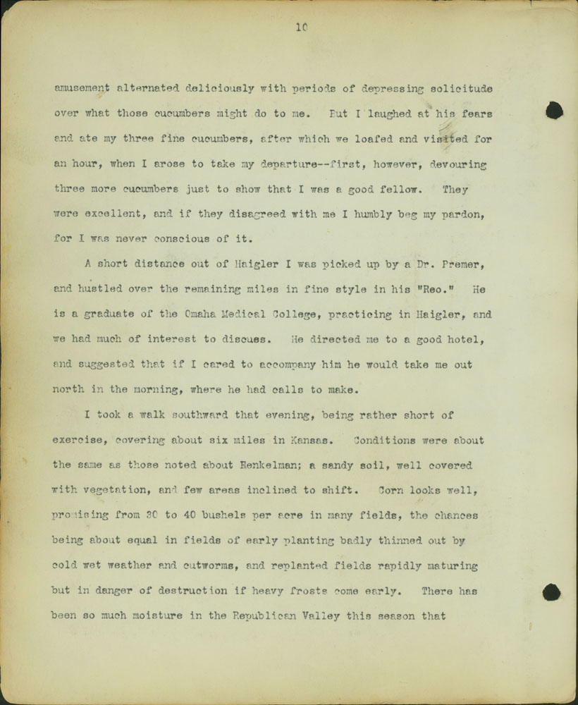 11 amusement alternated deliciously with periods of depressing solicitude over what those cucumbers might do to me. But I laughed at his fears and ate my three fine cucumbers, after which we loafed and visited for an hour, when I arose to take my departure–first, however, devouring three more cucumers just to show that I was a good fellow. They were excellent, and if they disagreed with me I humbly beg my pardon, for I was never conscious of it. A short distance out of Haigler I was picked up by a Dr. Premer , and hustled over the remaining miles in fine style in his “Reo.” He is a graduate of the Omaha Medical College, practicing in Haigler , and we had much of interest to discuss. He directed me to a good hotel, and suggested that if I cared to accompany him he would take me out north in the morning, where he had calls to make. I took a walk southward that evening, being rather short of exercise, covering about six miles in Kansas . Conditions were about the same as those noted about Henkelman ; a sandy soil, well covered with vegetation, and few areas inclined to shift. Corn looks well, promising from 30 to 40 bushels per acre in many fields, the chances being about equal in fields of early planting badly thinned out by cold wet weather and cutworms, and replanted fields rapidly maturing but in danger of destruction if heavy frosts come early. There has been so much moisture in the Republican Valley this season that