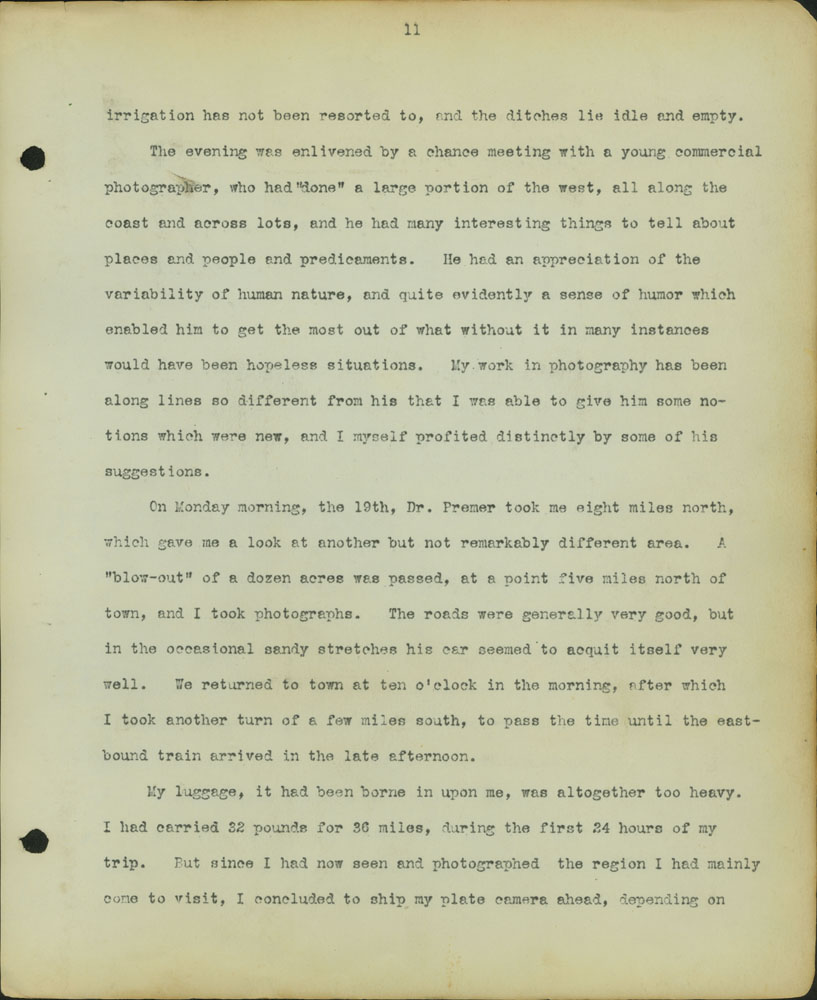12 irrigation has not been resorted to, and the ditches lie idle and empty. The evening was enliveded by a chance meeting with a young commercial photographer, who had “done” a large portion of the west, all along the coast and across lots, and he had many interesting things to tell about places and people and predicaments. He had an appreciation of the variability of human nature, and quite evidently a sense of humor which enabled him to get the most out of what without it in many instances would have been hopeless situations. My work in photography has been along lines so different from his that I was able to give him some notions which were new, and I myself profited distinctly by some of his suggestions. On Monday morning, the 19th, Dr. Premer took me eight miles north, which gave me a look at another but not remarkably different area. A “blow-out” of a dozen acres was passed, at a point five miles north of town, and I took photographs. The roads were generally very good, but in the occasional sandy stretches his car seemed to acquit itself very well. We returned to town at ten o’clock in the morning, after which I took another turn of a few miles south, to pass the time until the east bound train arrived in the late afternoon. My luggage, it had been borne in upon me, was altogether too heavy. I had carried 32 pounds for 36 miles, during the first 24 hours of my trip. But since I had now seen and photographed the region I had mainly come to visit, I concluded to ship my plate camera ahead, depending on