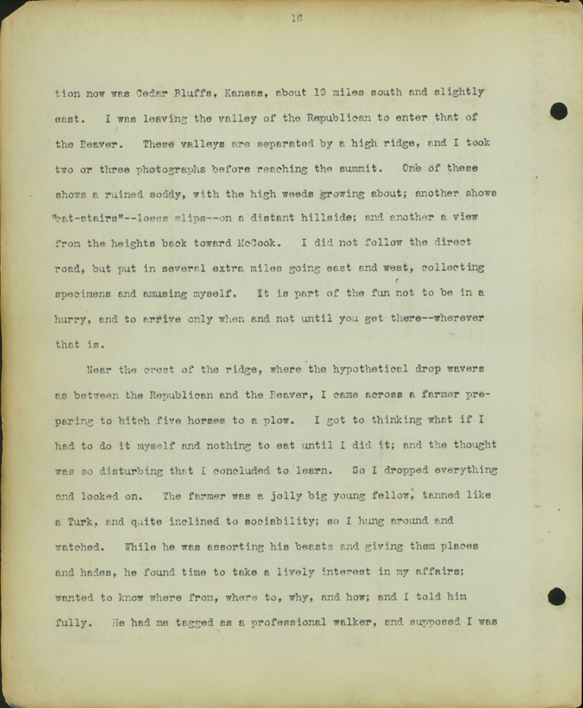 17 tion now was Cedar Bluffs , Kansas, about 19 miles south and slightly east. I was leaving the valley of the Republican to enter that of the Beaver. These valleys are separated by a high ridge, and I took two or three photographs before reaching the summit. One of these shows a ruined soddy, with the high weeds growing about; another shows “cat-stairs”–loess slips–on a distant hillside; and another a view from the heights back towards McCook . I did not follow the direct road, but put in several extra miles going east and west, collecting specimens and amusing myself. It is part of the fun not to be in a hurry, and to arrive only when and not until you get there–wherever that is. Near the crest of the ridge, where the hypothetical drop wavers as between the Republican and the Beaver, I came across a farmer preparing to hitch five horses to a plow. I got to thinking what if I had to do it myself and nothing to eat until I did it; and the thought was so disturbing that I concluded to learn. So I dropped everything and looked on. The farmer was a jolly big young fellow, tanned like a Turk, and quite inclined to sociability; so I hung around and watched. While he was assorting his beasts and giving them places and hades, he found time to take a lively interest in my affairs; want to know where from, where to, why, and how; and I told him fully. He had tagged me as a professional walker, and supposed I was