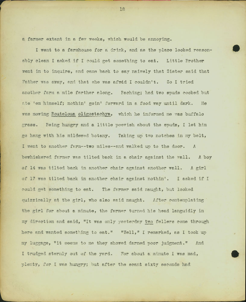 19 a farmer extent in a few weeks, which would be annoying. I went to a farmhouse for a drink, and as the place looked reasonably clean I asked if I could get something to eat. Little Brother went in to inquire, and came back to say naively that Sister said that Father was away, and that she was afraid I couldn’t. So I tried another farm a mile farther along. Baching; had two spuds cooked but ate ’em himself; nothin’ goin’ forward in a food way until dark. He was mowing Bouteloua oligostachya , which he informed me was buffalo grass. Being hungry and a little peevish about the spuds, I let him go hang with his mildewed botany. Taking up two notches in my belt, I went to another farm–two miles–and walked up to the door. A bewhiskered farmer was tilted back in a chair against the wall. A boy of 14 was tilted back in another chair against another wall. A girl of 17 was tilted back in another chair against nothin’. I asked if I could get something to eat. The farmer said naught, but looked quizzically at the girl, who also said naught. After contemplating the girl for about a minute, the farmer turned his head languidly in my direction and said, “It was only yesterday two fellers come through here and wanted something to eat.” “Well,” I remarked, as I took up my luggage, “it seems to me they showed darned poor judgement.” And I trudged sternly out of the yard. For about a minute I was mad, plenty, for I was hungry; but after the scant sixty seconds had