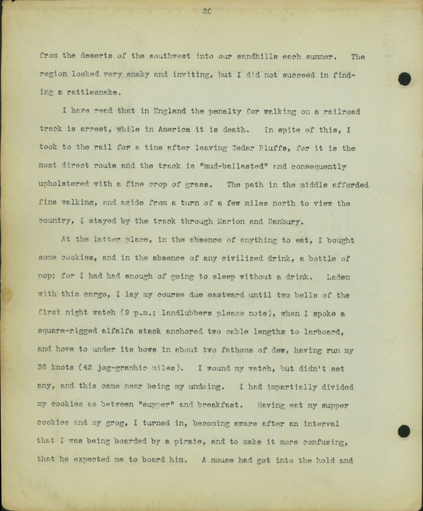 21 from the deserts of the southwest into our sandhills each summer. The region looked very snaky and inviting, but I did not succeed in finding a rattlesnake. I have read that in England the penalty for walking on a railroad track is arrest, while in American it is death. In spite of this, I took to the rail for a time after leaving Cedar Bluff, for it is the most direct route and the track is “mud-ballasted” and consequently upholstered with a fine crop of grass. The path in the middle afforded fine walking, and aside from a turn of a few miles north to view the country, I stayed by the track through Marion and Danbury . At the latter place , in the absence of anything to eat, I bought some cookies, and in the absence of any civilized drink, a bottle of pop; for I had had enough of going to sleep without a drink. Laden with this cargo, I lay my course due eastward until two bells of the first night watch (9 p.m.; landlubbers please note), when I spoke a square-rigged alfalfa stack anchored two cable lengths to larboard, and hove to under its bows in about two fathoms of dew, having run my 36 knots( 42 jog-graphic miles). I wound my watch, but didn’t set any, and this came near being my undoing. I had impartially divided my cookies as between “supper” and breakfast. Having eat my supper cookies and my grop, I turned in, becoming aware after an interval that I was being boarded by a pirate, and to make it more confusing, that he expected me to board him. A mouse had got into the hold and