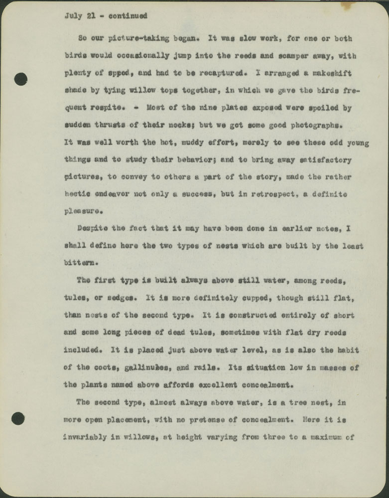 3 So our picture-taking began. It was slow work, for one or both birds would occasionally jump into the reeds and scamper away, with plenty of speed, and had to be recaptured. I arranged a makeshift shade by tying willow tops together, in wich we gave the birds frequent respite. — Most of the nine plates exposed were spoiled by sudden thrusts of their necks; but we got some good photographs. It was well worth the hot, muddy effort, merely to see these odd young things and to study their behavior; and to bring away satisfactory pictures, to convey to others a part of the story, made the rather hectic endeavor not only a success, but in retrospect, a definite pleasure. Despite the fact that it may have been done in earlier notes, I shall define here the two types of nests which are built by the least bittern. The first type is built always above still water, among reeds, tules, or sedges. It is more definitely cupped, though still flat, then nests of the second type. It is constructed entirely of short and some long pieces of dead tules, sometimes with flat dry reeds included. It is placed just above water level, as is also the habit of the coots, gallinubes, and rails. Its situation lowin masses of the plants named above affords excellent concealment. The second type, almost always above water, is a tree nest, in more open placement, with no pretense of concealment. Here it is invariably in willows, at height varying from three to a maximum of