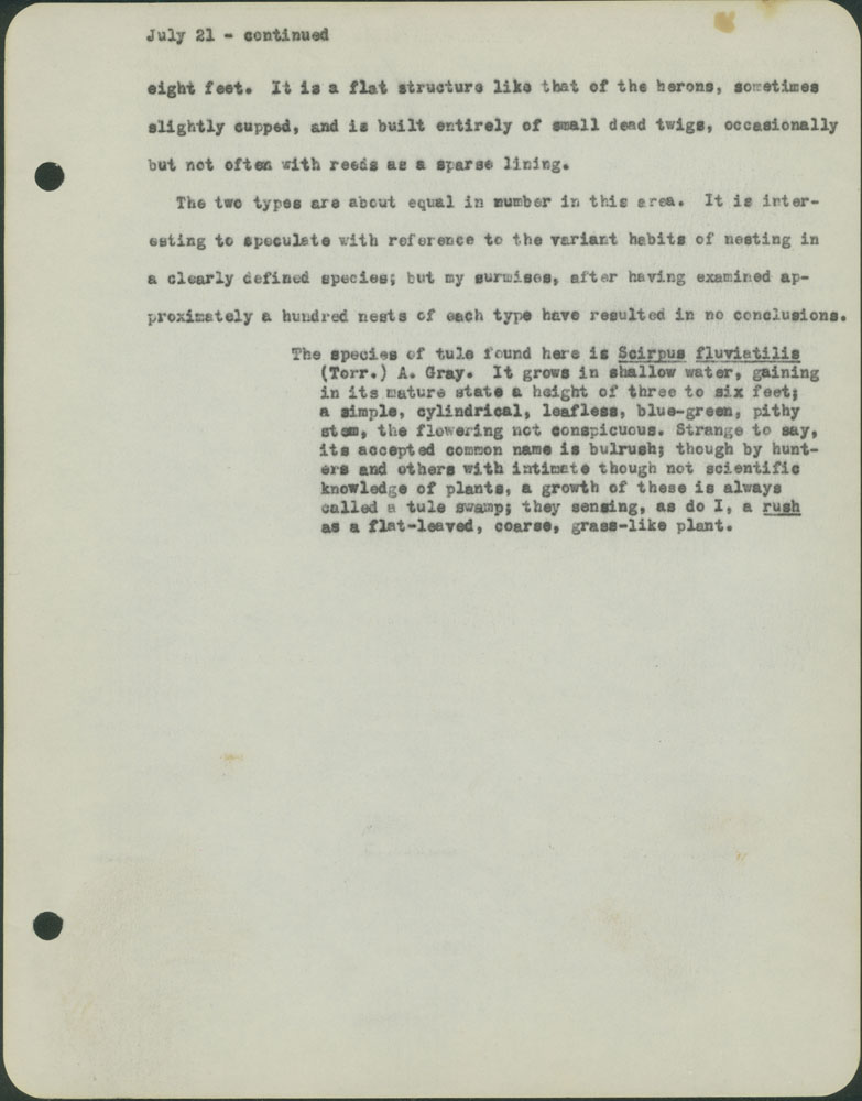 4 eight feet. It is a flat structure like that of the herons, sometimes slightly cupped, and is built entirely of small dead twigs, occasionally but not often with reeds as a sparse lining. The two types are about equal in number in this area. It is interesting to speculate with reference to the variant habits of nesting in a clearly defined species; but my experience after having examined approximately a hundred nests of each type have resulted in no conclusions. The species of tule found here is Scirpus fluviatilis (Torr.) A. Gray. It grows in shallow water, gaining in its mature state a height of three to six feet; a simple, cylindrical, leafless, blue-green, pithy stem, the flowering not conspicuous. Strange to say, its accepted common name is bulrush; through by hunters and others with intimate though not scientific knowledge of plants, a growth of these is always called a tule swamp; they sensing, as do I, a rush as a flat-leaved, coarse, grass-like plant.