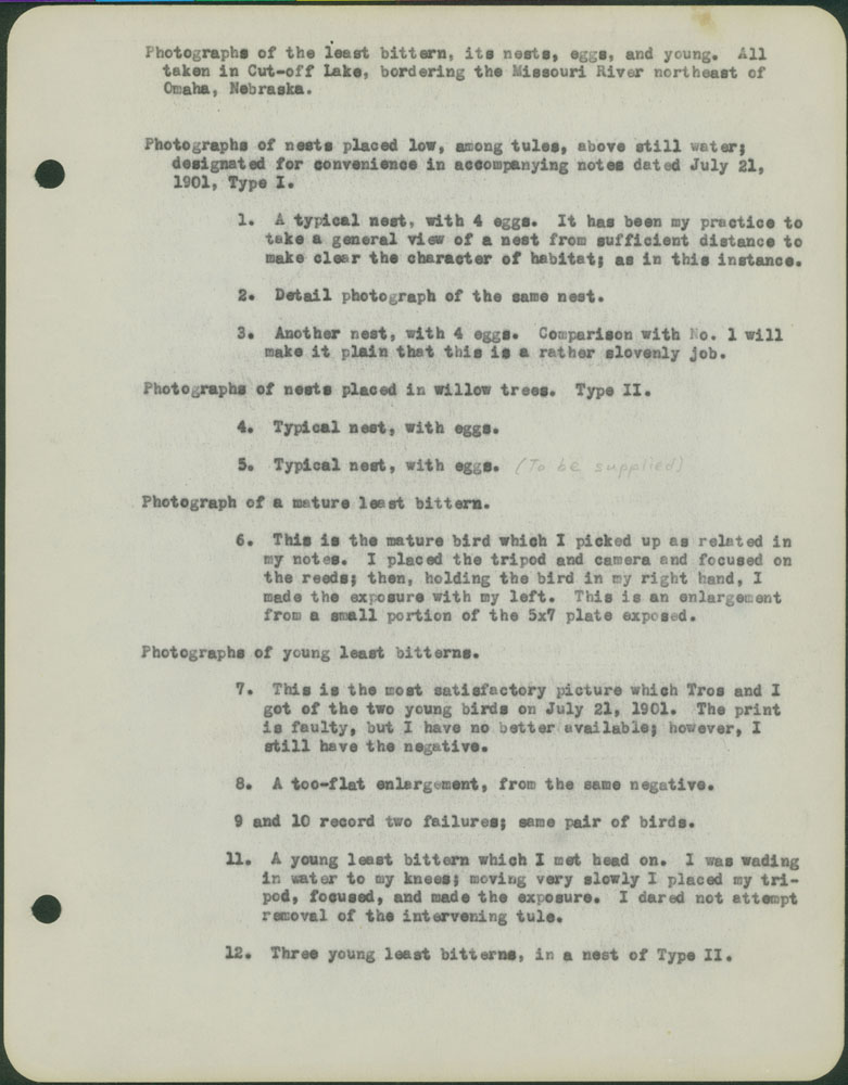 5 **Photographs of the least bitterns, its nests, eggs, and young. All taken in Cut-off Lake, bordering the Missouri River northeast of Omaha , Nebraska .** **Photographs of nests placed low, among tules, above still water, designated for convenience in accompanying notes dated July 21, 1901, Type I** • 1. A typical nest, with 4 eggs. It has been my practice to take a general view of a nest from sufficient distance to make clear the character of the habitat; as in this instance.; 2. Detail photograph of same nest.; 3. Another nest, with 4 eggs. Comparison with No. 1 will make it plain that this is a rather slovenly job. **Photographs of nests placed in willow trees. Type II.** • 4. Typical nest, with eggs.; 5. Typical nest, with eggs. **Photograph of a mature least bittern.** • 6. This is the mature bird which I picked up as related in my notes. I placed the tripod and camera and focused on the reeds; then, holding the bird in my right hand, I made the exposrue with my left. This is an enlargement from a small portion of the 5×7 plate exposed. **Photograph of the young least bitterns.** • 7. This is the most satisfactory picture which Tros and I got of the two young birds on July 21, 1901. The print is faulty, but I have no better available; however, I still have the negative.; 8. A too-flat enlargement, from the same negative.; 9 and 10 record two failures; same pair of birds.; 11. A young least bittern which I met head on. I was wading in the water to my knees; moving very slowly I placed my tripod, focused, and made the exposure. I dared not attempt removal of the intervening tule.; 12. Three young least bitterns, in a nest of Type II.