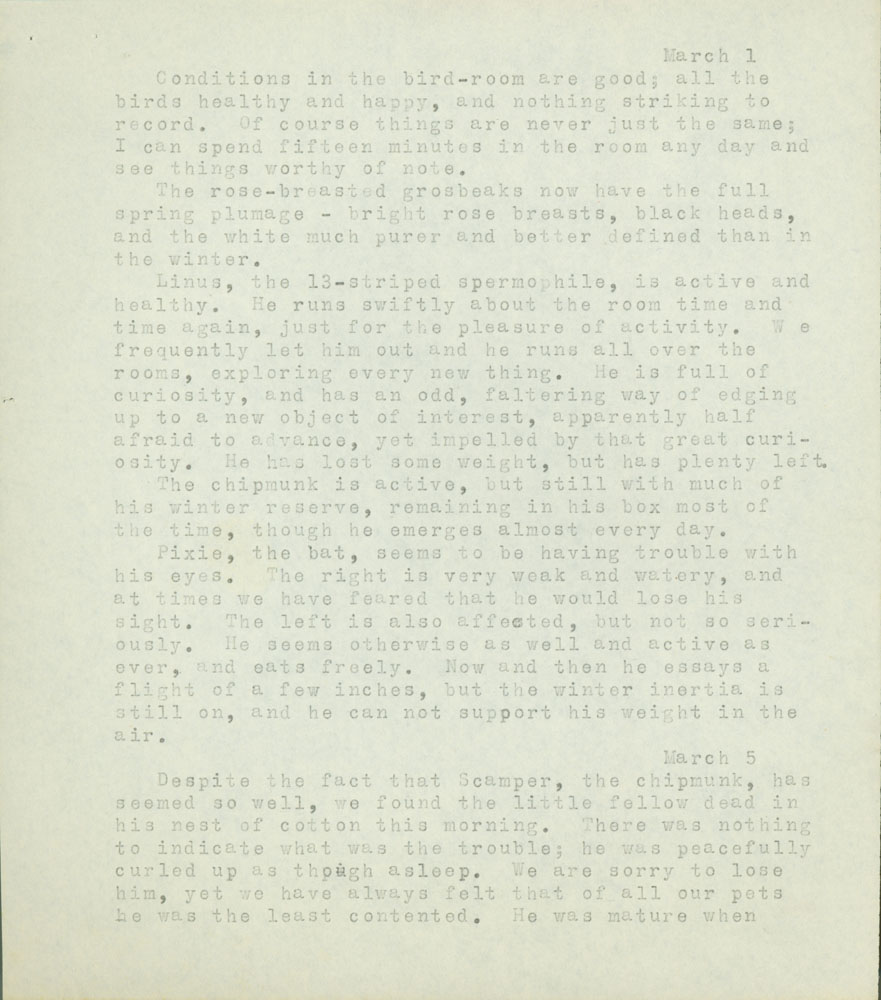 2 Conditions in the bird-room are good; all the birds healthy and happy, and nothing striking to record. Of course things are never just the same; I can spend fifteen minutes in the room any day and see things worthy of note. The rose-breasted grosbeaks now have the full spring plummage "“ bright rose breasts, black heads, and the white much purer and better defined than in the winter. Linus, the 13-stripped spermophile is active and healthy. He runs swiftly about the room time and time again, just for the pleasure of the activity. We frequently let him out and he runs all over the rooms, exploring every new thing. He is full of curiousity, and has an odd, faltering way of edging up to a new object of interest, apparently half afraid to advance, yet impelled by that great curiousity. He has lost some weight, but has plenty left. The chipmunk is active, but still with much of his winter reserve, remaining in his box most of the time, though he emerges almost every day. Pixie, the bat, seems to be having trouble with his eyes. The right is very weak and watery, and at times we have feared that he would lose his sight. The left is also affected, but not so seriously. He seems otherwise as well an active as ever, and eats freely. Now and then he essays a flights of a few inches, but the winter inertia is still on, and he can not support his weight in the air. March 5 Despite the fact that Scamper, the chipmunk, has seems so well, we found the little fellow dead in his nest of cotton this morning. There was nothing to indicate what was the trouble; he was peacefully curled up as though asleep. We are sorry to lose him, yet we have always felt that of all our pets he was the least contented. He was mature when