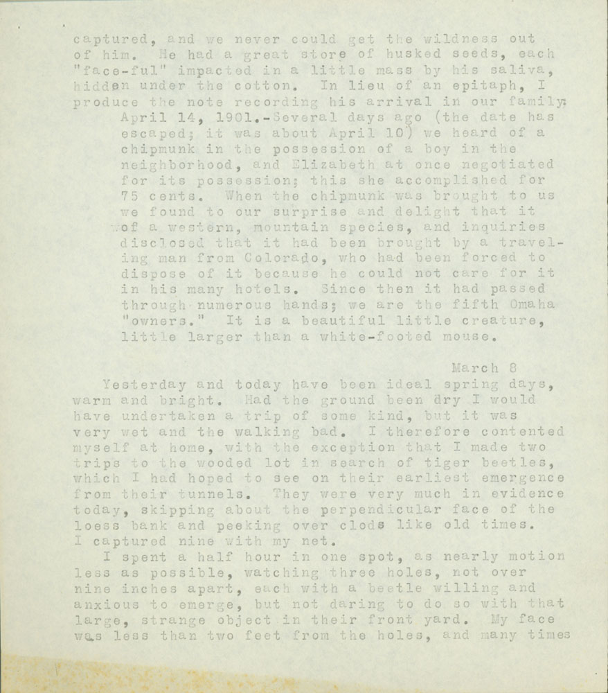 3 captured, and we never could get the wildness out of him. He had a great store of husked seeds, each "face-ful" impacted in a little mass by his saliva, hidden under the cotton. In lieu of an epitaph, I produce the note recording his arrival in our family: April 14, 1901.-Several days ago (the date has escaped; it was about April 10) we heard of a chipmunk in the possession of a boy in the neighborhood, and Elizabeth at once negotiated for its possession; this she accomplished for 75 cents. When the chipmunk was brought to us we found to our surprise and delight that it sic of a western , mountain species, and inquiries disclosed that it had been brought by a traveling man from Colorado, who had been forced to dispose of it because he could not care fir it in his many hotels. Since then it had passed through numerous hands; we are the fifth Omaha "owners." It is a beautiful little creature, little larger than a white-footed mouse. March 8 Yesterday and today have been ideal spring days, warm and bright. Had the ground been dry I would have undertaken a trip of some kind, but it was very wet and the walking bad. I therefore contented myself at home, with the exception that I made two trips to the wooded lot in search of tiger beetles, which I had hoped to see on their earliest emergence from their tunnels. They were very much in evidence today, skipping about the perpendicular face of the loess bank and peaking over clods like old times. I captured nine with my net. I spent a half hour in one spot, as nearly motionless as possible, watching three holes, not over nine inches apart, each with a beetle willing and anxious to emerge, but not daring to do so with that large, strange object in their front year. My face was less than two feet from the holes, and many times