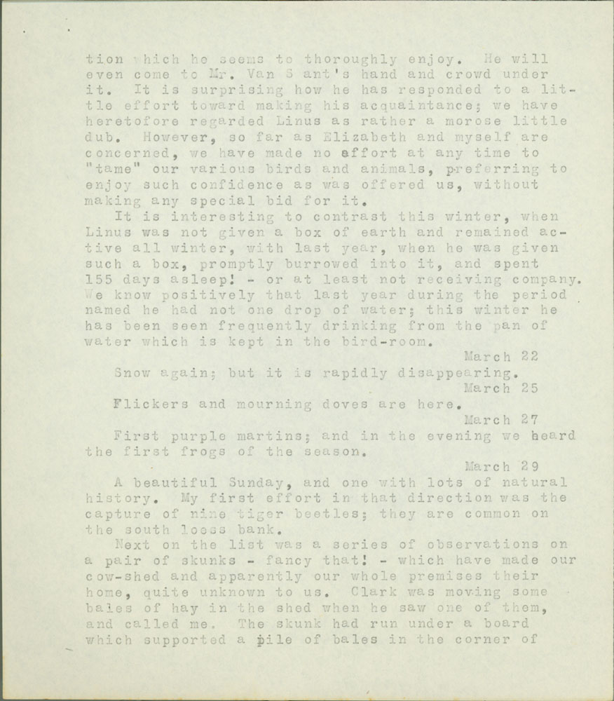 5 tion which he seems to thoroughly enjoy. He will even come to Mr. Van Sant's hand and crowd under it. It is surprising how he has responded to a little effort toward making his acquaintance; we have heretofore regarded Linus as rather a morose little dub. However, so far as Elizabeth and myself are concerned, we have made no effort at any time to "tame" our various birds and animals, preferring to enjoy such confidence as was offered us, without making any special bid for it. It is interesting to contrast this winter, when Linus was not given a box of earth and remained active all winter, with last year, when he was given such a box, promptly burrowed into it, and spent 155 days asleep! - or at least not receiving company. We know positively that last year during the period names he had not one drop of water; this winter he has been frequently drinking from the pan of water which is kept in the bird-room. March 22 Snow again; but is is rapidly disappearing. March 25 Flickers and mourning doves are here. First purple martins; and in the evening we hear the first frogs of the season. March 29 A beautiful Sunday, and one with lots of natural history. My first effort in the direction was the capture of nine tiger beetles; they are common on the south loess bank. Next on the list was a series of observations on a pair of skunks - fancy that! - which have made our cow-shed and apparently our whole premises their home, quite unknown to use. Clark was moving some bales of hay in the shed when he saw one of them, and called me. The skunk had run under a board which supported a pile of bales in the corner of