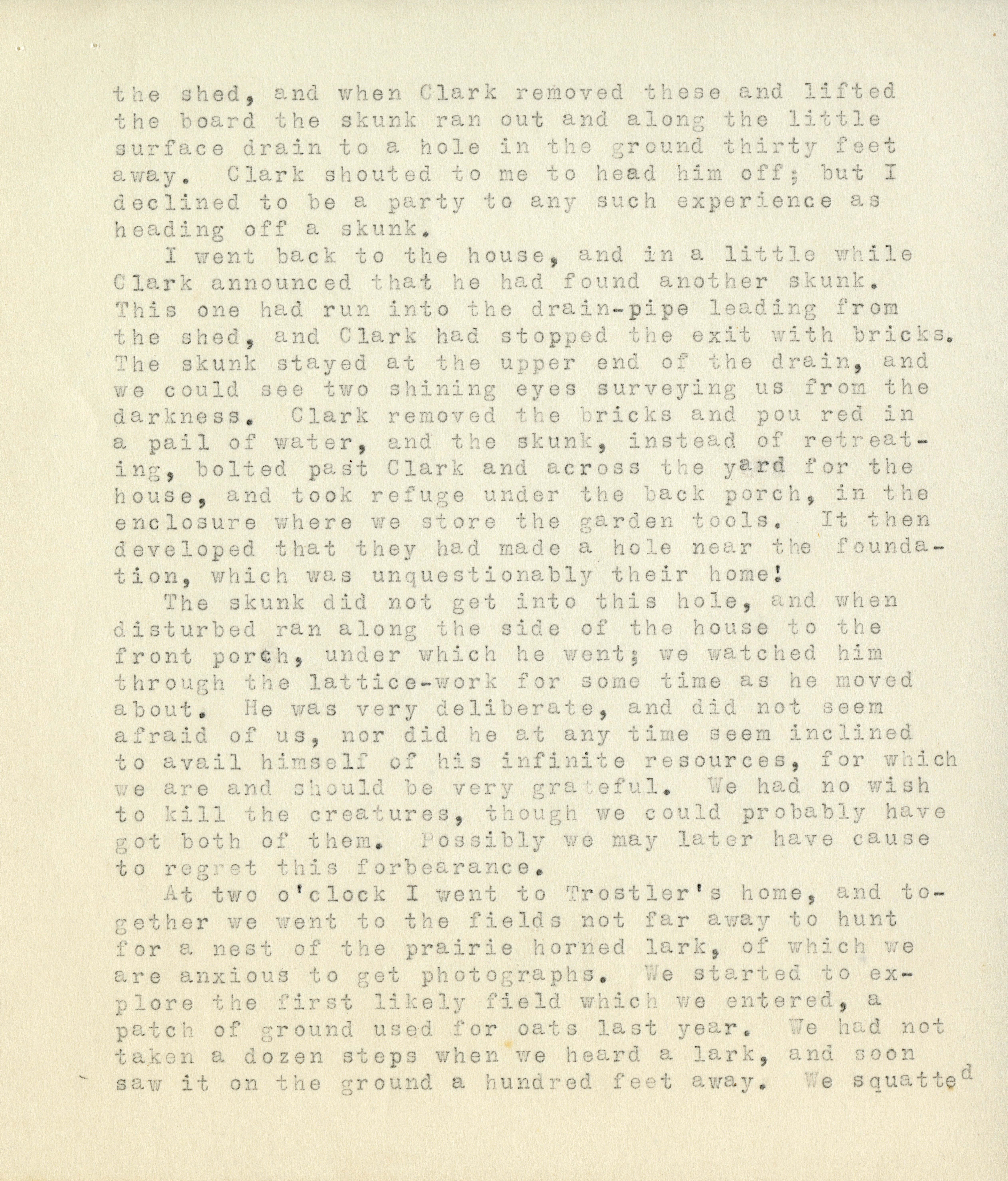 6 the shed, and when Clark removed these and lifted the board the skunk ran out and along the little surface drain to a hole in the ground thirty feet away. Clark shouted to me to head him off; but I declined to be a party to any such experience as heading off a skunk. I went back to the house, and in a little while Clark announced that he had found another skunk. This one had run into the drain-pipe leading from the shed, and Clark had stopped the exit with bricks. The skunk stayed at the upper end of the drain, and we could see two shining eyes surveying us from the darkness. Clark removed the bricks and poured in a pail of water, and the skunk, instead of retreating, bolted past Clark and across the yard for the house, and took refuge under the back porch, in the enclosure where we store the garden tools. It then developed that they had made a hole near the foundation, which was unquestionably their home! The skunk did not get into this hole, and when disturbed ran along the side of the house to the front porch, under which he went; we watched him through the lattice-work for some time as he moved about. He was very deliberate, and did not seem afraid of us, nor did he at any time seem inclined to avail himself of his infinite resources, for which we are and should be grateful. We had no wish to kill the creatures, though we could probably have got both of them. Possibly we may later have cause to regret this forbearance. At two o'clock I went to Trostler's home, and together we went to the fields not far away to hunt for a nest of the prairie horned lark, of which we are anxious to get photographs. We started to explore the first likely field which we entered, a patch of ground used for oats last year. We had not taken a dozen steps when we hear a lark, and soon saw it on the ground a hundred feet away. We squatted
