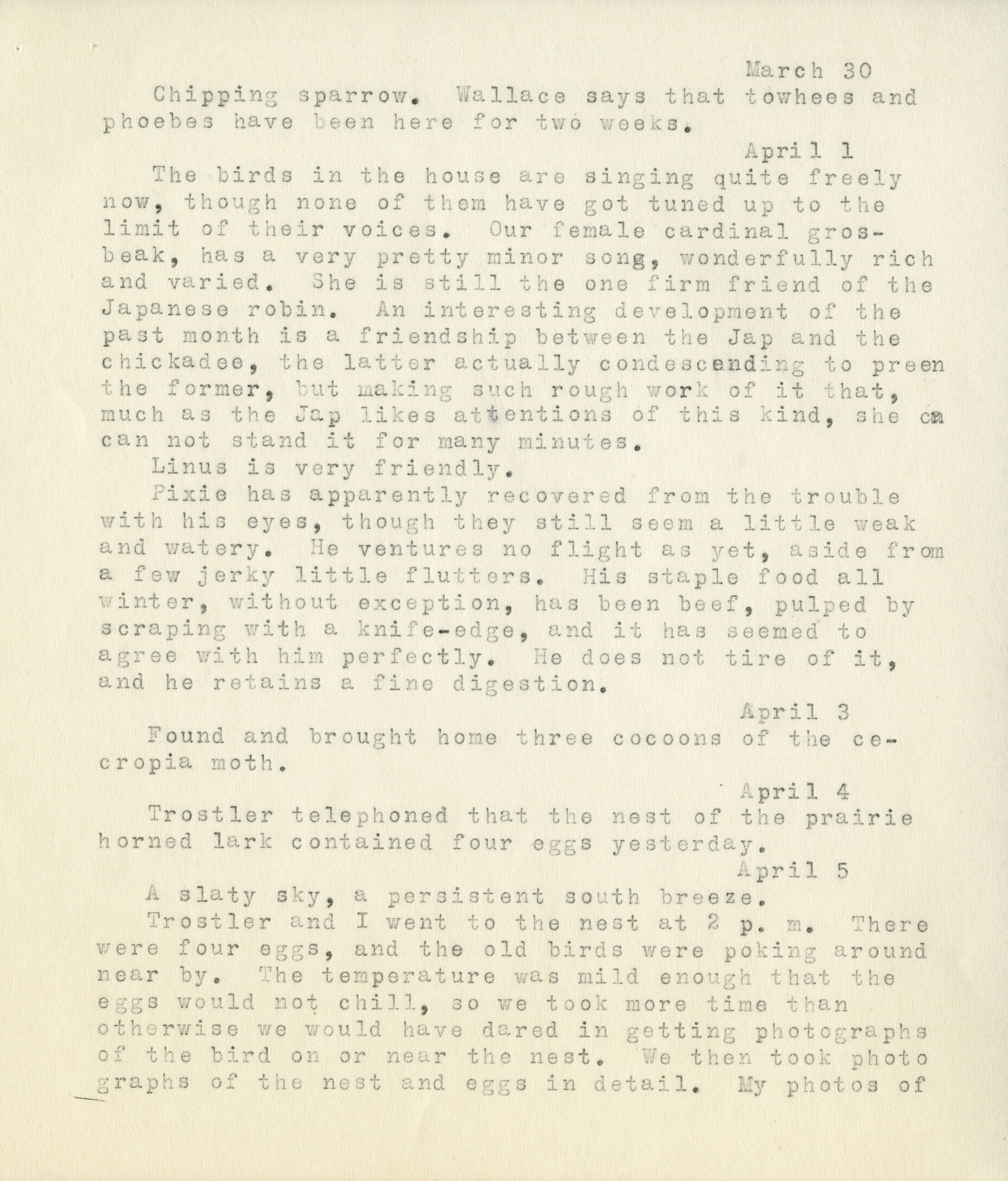 9 March 30 Chipping sparrow. Wallace says that towhees and phoebes have been here for two weeks. April 1 The birds in the house are singing quite freely now, though none of them have got tuned up to the limit of their voices. Our female cardinal grosbeak, has a very pretty minor song, wonderfully rich and varied. She is still the one firm friend of the Japanese robin. An interesting development of the past month is the friendship between the Jap and the chickadee, the latter actually condescending to preen the former, but making such rough work of it that, much as the Jap likes attentions of this kind, she ca can not stand it for many minutes. Linus is very friendly Pixie has apparently recovered from the trouble with his eyes, though they still seem a little weak and watery. He ventures no flight as yet, aside from a few jerky flutters. His staple food all winter, without exception, has been beef, pulped by scraping a knife-edge, and it has seems to agree with him perfectly. He does not tire of it, and he retains a fine digestion. April 3 Found and brought home three cocoons of the cecropia moth. April 4 Trostler telephoned that the nest of the prairie horned lark contained four eggs yesterday. April 5 A slaty sky, a persistent south breeze. Trostler and I went to the nest at 2 p.m. There were four eggs, and the old birds were poking around near by. The temperature was mild enough that the eggs would not chill, so we took more time than otherwise we would have dared in getting photographs of the bird on or near the nest. We then took photographs of the nest and eggs in detail. My photos of