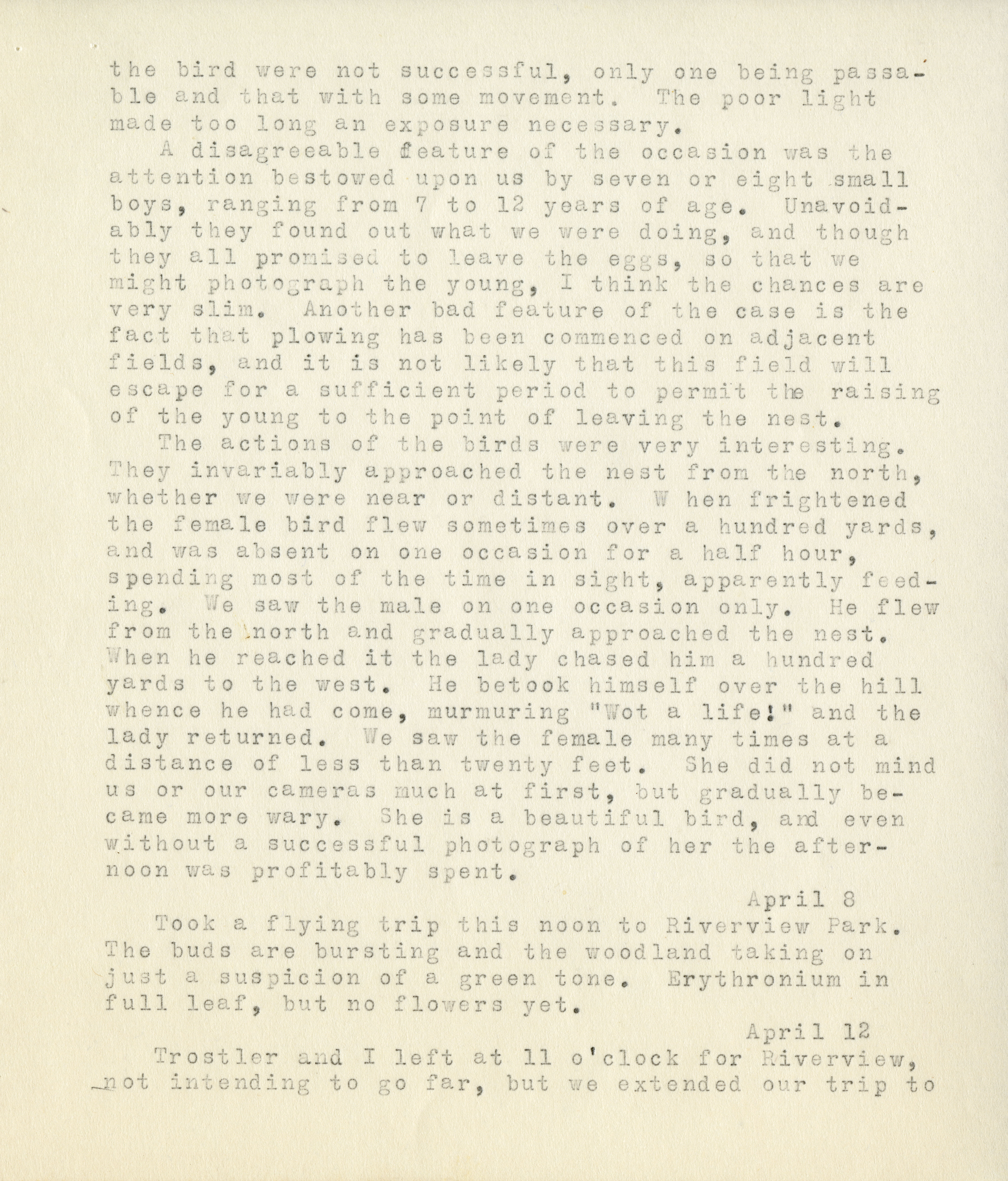 10 the bird were not successful, only one being passable and that with some movement. The poor light made too long an exposure necessary. A disagreeable feature of the occasion was the attention bestowed upon us by seven or eight small boys, ranging from 7 to 12 years of age. Unavoidably they found out what we were doing, and though they all promised to leave the eggs, so that we might photograph the young, I think the chances are very slim. Another bad feature of the case is that fact that plowing commenced on adjacent fields, and it is not likely that this field will escape for a sufficient period to permit the raising of the young to the point of leaving the nest. The actions of the birds were very interesting. They invariably approached the nest from the north, whether we were near or distant. When frightened the female bird flew sometimes over a hundred yards, and was absent on one occasion for a half hour, spending most of the time in sight, apparently feeding. We saw the male on one occasion only. He flew from the north and gradually approached the nest. When he reached it the lady chased him a hundred yards to the west. He betook himself over the hill whence he had come, murmuring "Wot a life!" and the lady returned. We saw the female many times at a distance of less than twenty feet. She did not mind us or our cameras much at first, but gradually became more wary. She is a beautiful bird, and even without a successful photograph of her the afternoon was profitably spent. April 8 Took a flying trip this noon to Riverview Park. The buds are bursting and the woodland taking on just a suspicion of a green tone. Erythronium in full leaf, but no flowers yet. April 12 Trostler and I left at 11 o'clock for Riverview, not intending to go far, but we extended our trip to