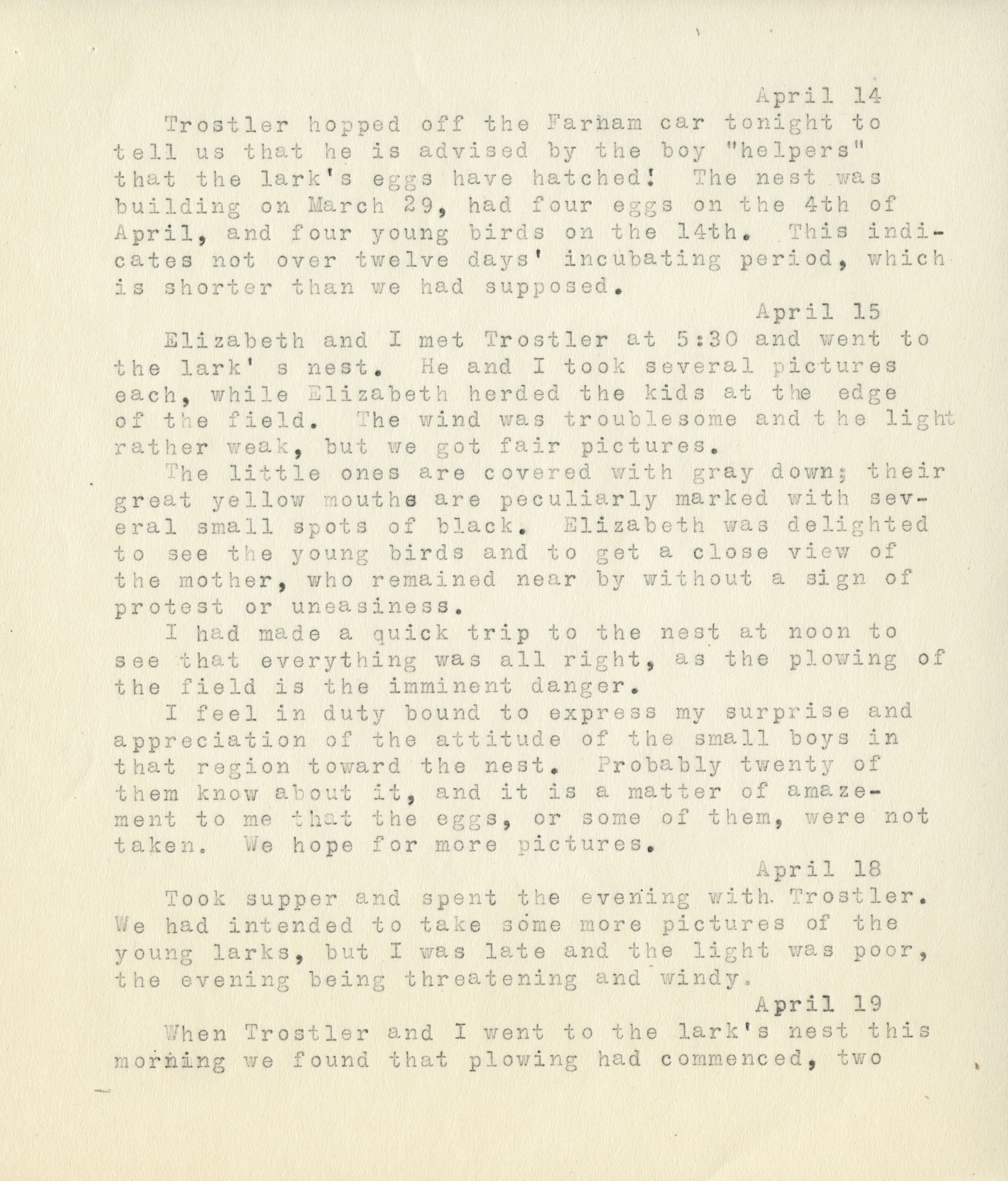 12 April 14 Trostler hopped off the Farnam car tonight to tell us that he is advised by the boy "helpers" that the lark's eggs have hatched! The nest was building on March 29, had four eggs on the 4th of April, and four young birds on the 14th. This indicates not over twelve days' incubating period, which is shorter than we had supposed. April 15 Elizabeth and I met Trostler at 5:30 and went to the lark's nest. He and I took several pictures of each, while Elizabeth herded the kids at the edge of the field. The wind was troublesome and the light rather weak, but we got fair pictures. The little ones are covered with gray down; their great yellow mouths are peculiarly marked with several small spots of black. Elizabeth was delighted to see the young birds and get a close view of the mother, who remained neaer by without a sign of protest of uneasiness. I had made a quick trip to the nest at noon to see that everything was all right, as the plowing of the field is the imminent danger. I feel in in duty bound to express my surprise and appreciation of the attitude of the small boys in that region toward the nest. Probably twenty of them know about it, and it is a matter of amazement to me that the eggs, or some of them, were not taken. We hope for more pictures. April 18 Took supper and spent the evening with Trostler . We had intended to take some more pictures of the young larks, but I was late and the light was poor, the evening being threatening and windy. April 19 When Trostler and I went to the lark's nest this morning we found that plowing had commenced, two