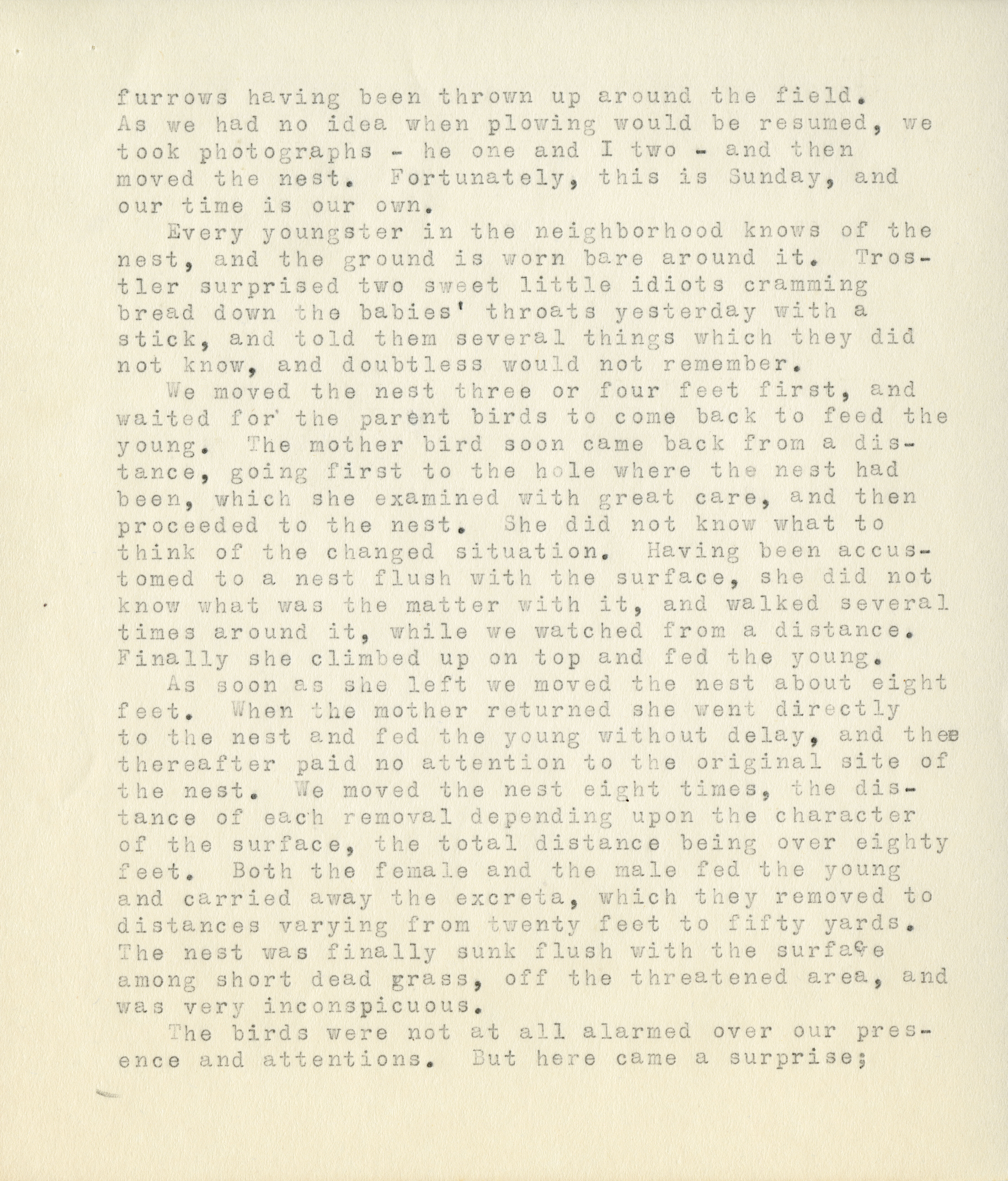 13 furrows having been thrown up around the field. As we had no idea when plowing would be resumed, we took photographs - he one and I two - and then moved the nest. Fortunately, this is Sunday, and our time is our own. Every youngster in the neighborhood knows of the nest, and the ground is worn bare around it. Trostler surprised two sweet little idiots cramming bread down the babies' throats yesterday with a stick, and told them several things which this did not know, and doubtless would not remember. We moved the nest three or four feet first, and waited for the parent birds to come back to feed the young. The mother bird soon came back from a distance, going first to the hole where the nest had been, which she examined with great care, and then proceeded to the nest. She did not know what to think of the changed situation. Having been accustomed to a nest flush with the surface, she did not know what was the matter with it, and walked several times around it, while we watched from a distance. Finally she climbed up on top and feed the young. As soon as she left we moved the nest about eight feet. When the mother returned she went directly to the nest and fed the young without delay, and thee thereafter paid no attention to the original site of the nest. We moved the nest eight times, the distance of each removal depending upon the character of the surface, the total distance being over eighty feet. Both the female and the male fed the young and carried away the excreta, which they removed to distances varying from twenty feet to fifty yards. The nest was finally sunk flush with the surface among short dead grass, off the threatened area, and was very inconspicuous. The birds were not at all alarmed over our presence and attentions. But here came a surprise;