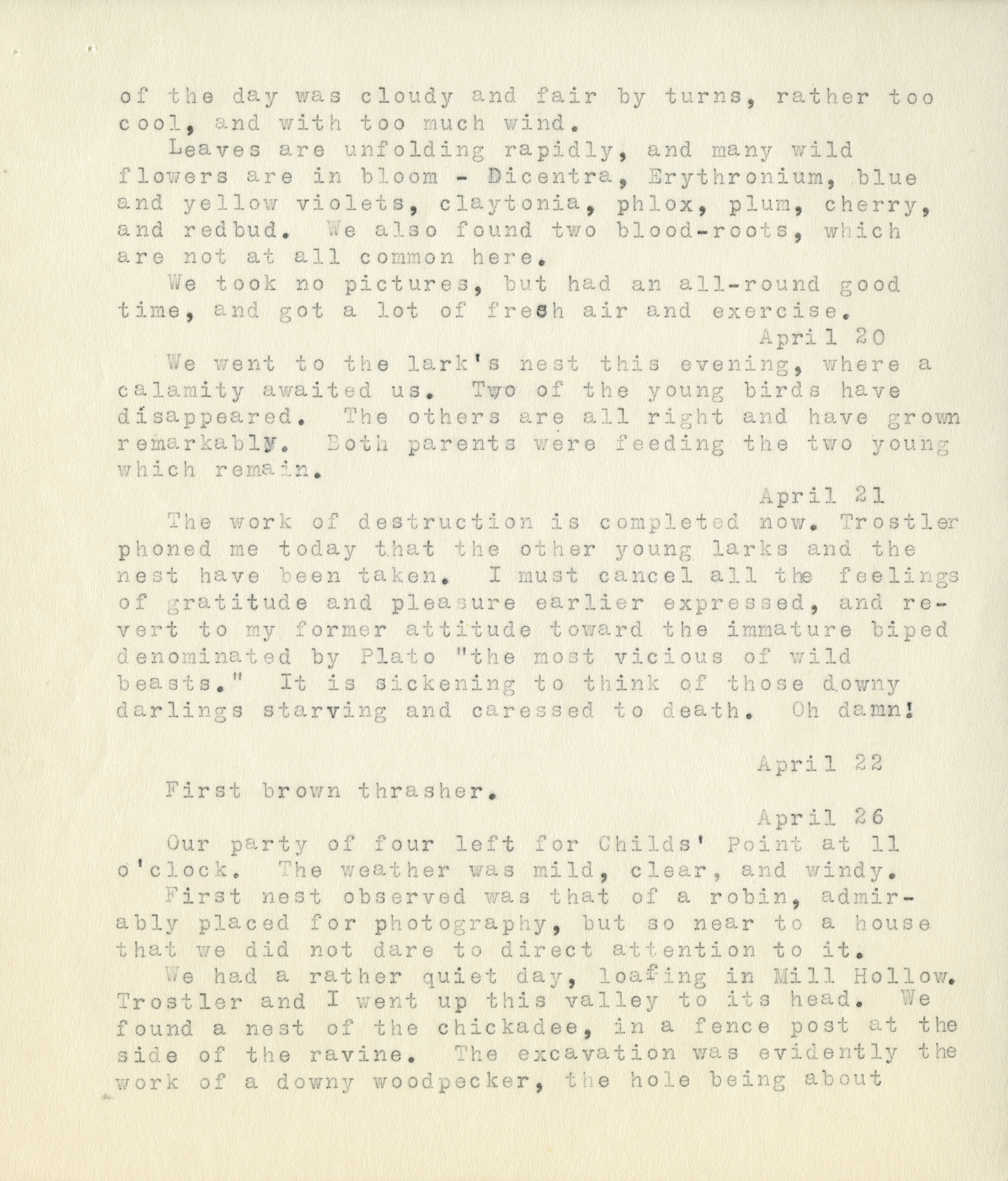 15 of the day was cloudy and fair by turns, rather too cool, and with too much wind. Leaves are unfolding rapidly, and many wild flowers are in bloom - Dicentra , Erythronium , blue and yellow violets, claytonia, phlox, plum, cherry, and redbud. We also found two blood-roots, which are not at all common here. We took no pictures, but had an all-around good time, and got a lot of fresh air and exercise. April 20 We went to the lark's nest this evening, where a calamity awaited us. Two of the young birds have disappeared. The others are all right and have grown remarkably. Both parents were feeding the two young which remain. April 21 The work of destruction is completed now. Trostler phoned me today that the other young larks and the nest have been taken. I must cancel all feelings of gratitude and pleasure earlier expressed, and revert to my former attitude toward the immature biped denominated by Plato "the most vicious of wild beasts." It is sickening to think of those downy darlings starving and caressed to death. Oh damn! April 22 First brown thrasher April 26 Our party of four left for Childs' Point at 11 o'clock. The weather was mild, clear, and windy. First nest observed was that of a robin, admirably placed for photography, but so near to a house that we did not dare to direct attention to it. We had a rather quiet day, loafing in Mill Hollow. Trostler and I went up this valley to its head. We found a nest of the chickadree, in a fence post at the side of the ravine. The excavation was evidently the work of a downy woodpecker, to the hole being about