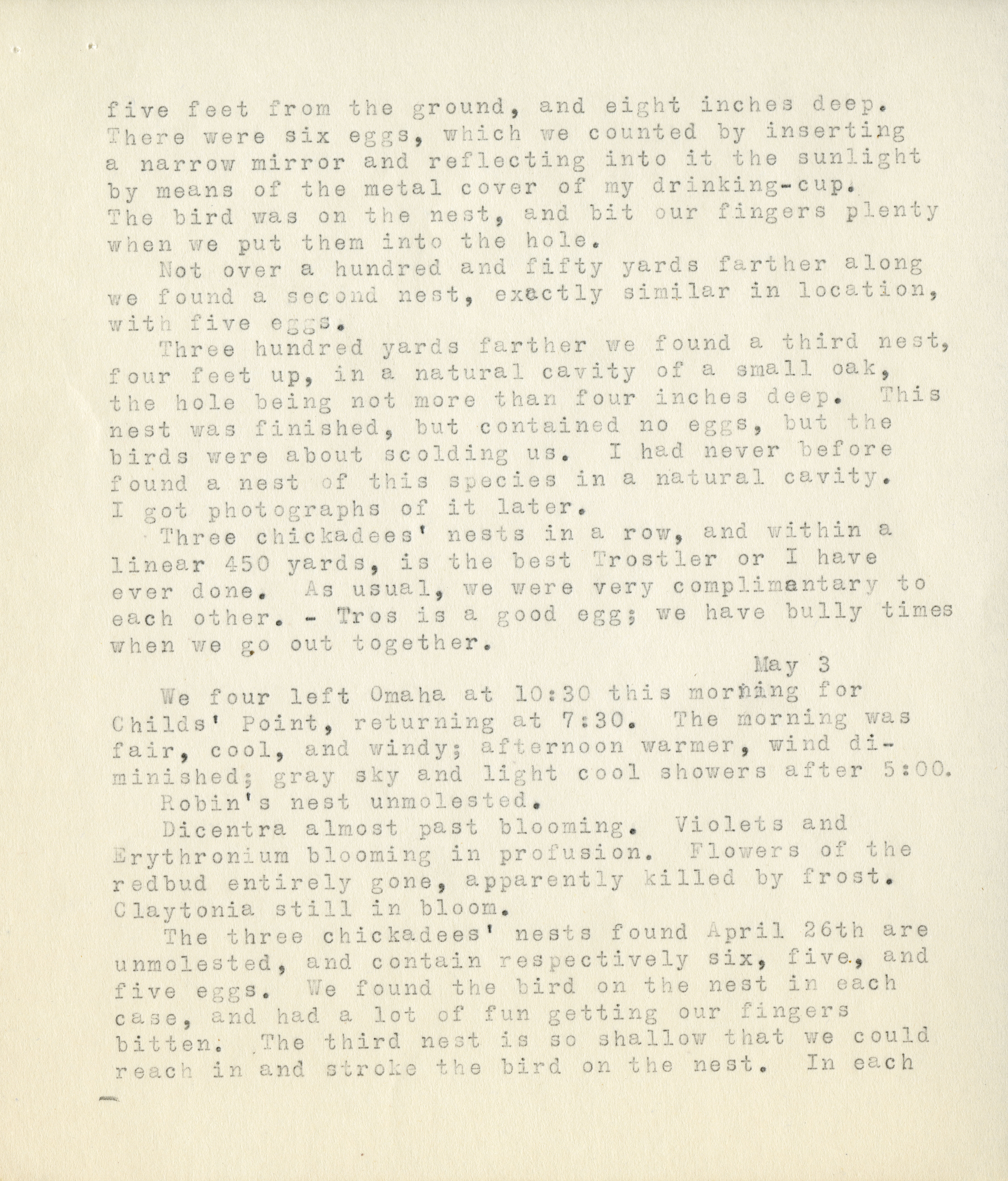 16 five feet from the gound, and eight inches deep. There were six eggs, which we counted by inserting a narrow mirror and reflecting into it the sunlight by means of the metal cover of my drinking-cup. The bird was on the nest, and bit our fingers plenty when we put them into the hole. Not over a hundred and fifty yards farther along we found a second nest, exactly similar in location, with five eggs. Three hundred yards farther we found a third nest, four feet up, in a natural cavity of a small oak, the hole being not more than four inches deep. This nest was finished, but contained no eggs, bu the birds were about scolding us. I had never before found a nest of this species in a natural cavity. I got photographs of it later. Three chickadees' nests in a row, and within a linear 450 yeards, is the best Trostler or I have ever done. As usual, we were very complimentary to each other. - Tros is a good eggs; we have bully times when we go out together. May 3 We four left Omaha at 10:30 this moring for Childs' Point, returning at 7:30. The morning was fair, cool, and windy; afternoon warmer, wind diminished; gray sky and light cool showers after 5:00. Robin's nest unmolested. Dicentra almost past blooming. Violets and Erythronium blooming in profusion. Flowers of the redbud entirely gone, apparently killed by frost. Claytonia still in bloom. The three chickadee's nests found April 26th are unmolested, and contain respectively six, five, and five eggs. We found the bird on the nest in each case, and had a lot of fun getting our fingers bitten. The third nest is so shallow that we could reach in and stroke the bird on thenest. In each
