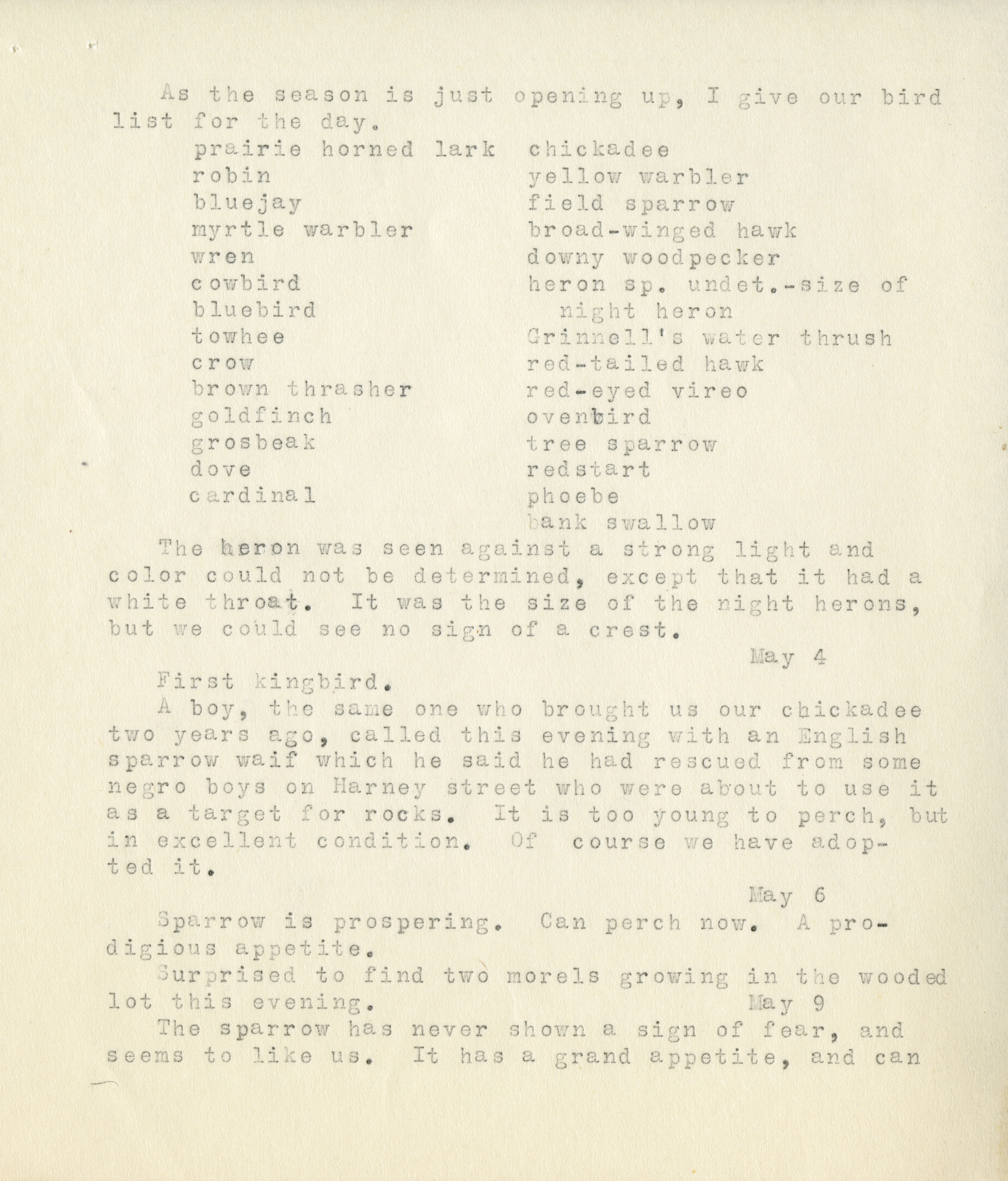 18 As the season is just opening up, I give our bird list for the day. prairie horned lark chickadee robin yellow warbler bluejay field sparrow myrtle warbler broad-winged hawk wren downy woodpecker cowbird heron sp. undet.-size of bluebird night heron towhee Grinnell's water thrush crow red-tailed hawk brown thrasher red-eyed vireo goldfinch ovenbird grosbeak tree sparrow dove redstart cardinal phoebe bank swallow The heron was seen against a stong light and color could not be determined, except that it had a white throat. It was the size of the night herons, be we could see no sign of a crest. May 4 First kingbird. A boy, the same one who brought us our chickadee two years ago, called this evening with an English sparrow waif which he said he had rescued from some negro boys on Harney street who were about to use it as a target for rocks. It is too young to perch, but in excellent condition. Of course we have adopted it. May 6 Sparrow is prospering. Can perch now. A prodigious appetite. Surprised to find two morels growing in the wooded lot this evening. The sparrow has never shown a sign of fear, and seems to like us. It has a grand appetite, and can