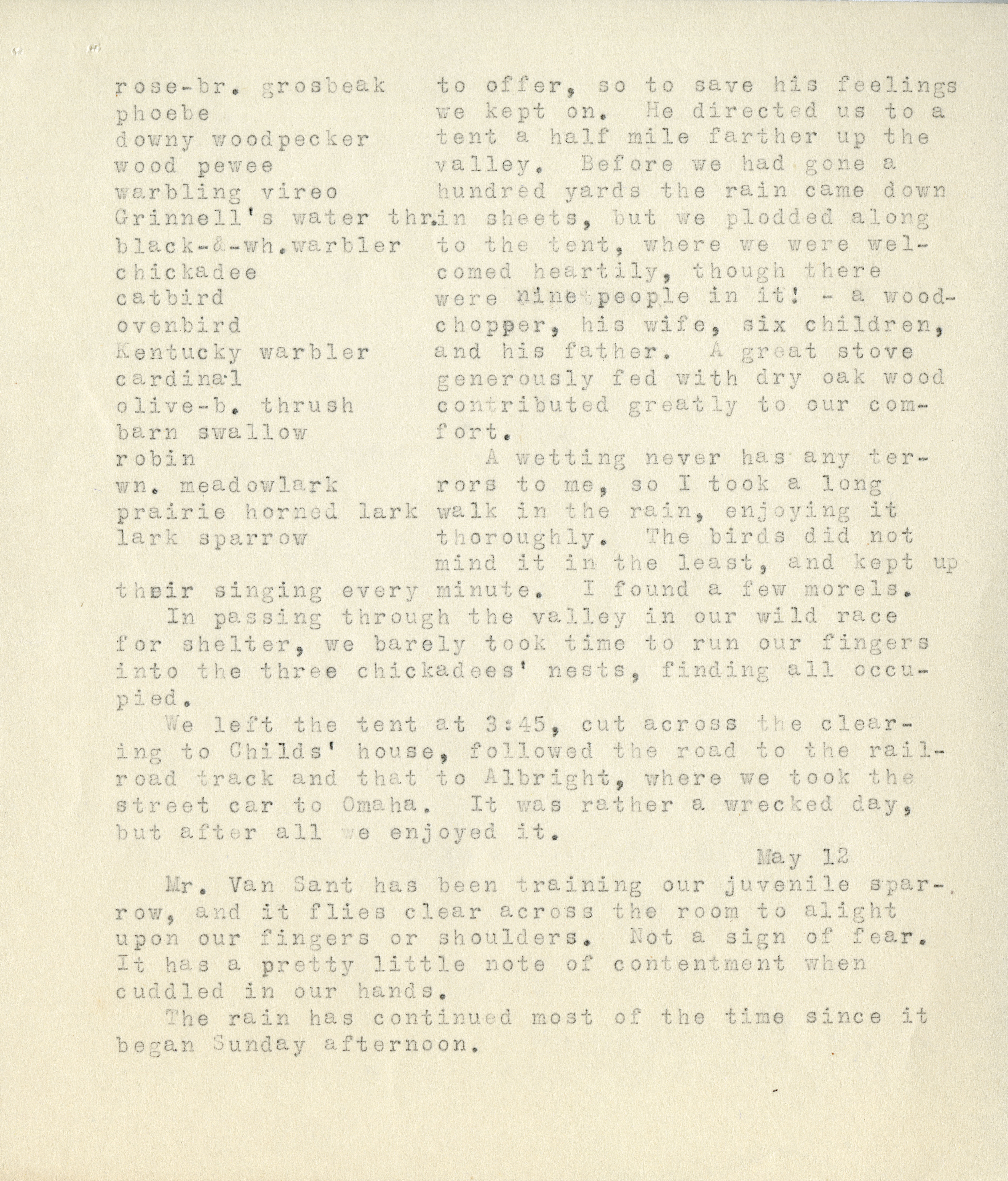 20 rose-br. grosbeak to offer, so to save his feelings phoebe we kept on. He directed us to a downy woodpecker tent a half mile farther up the wood pewee valley. Before we had gone a warbling vireo hundred yards the rain come down Grinnell's water thr. in sheets, but we plodded along black-&-wh.warbler to the tent, where we were welcomed chickadee heartily, though there catbird were nine people in it! - a woodchopper ovenbird his wife, six children, Kentucky warbler and his father. A great stove cardinal generously fed with dry oak wood olive-b. thrush contributed greatly to our comfort. barn swallow A wetting never has any terrors robin to me, so I took a long wm. meadowlark walk in the rain, enjoying it prairie horned lark thoroughly. The birds did not lark sparrow mind it in the least, and kept up their singing every minute. I found a few morels In passing through the valley in our wild race for shelter, we barely took time to run our fingers into the three chickadees' nests, finding all occupied. We left the tent at 3:45, cut across the clearing to Childs' house, followed the road to the railroad track adn that to Albright, where we took the street car to Omaha. It was rather a wrecked day, but after all we enjoyed it. May 12 Mr. Van Sant has been training our juvenile sparrow, and it flied clear across the room to alight upon our fingers or shoulders. Not a sign of fear. It has a pretty little note of contentment when cuddled in our hands.