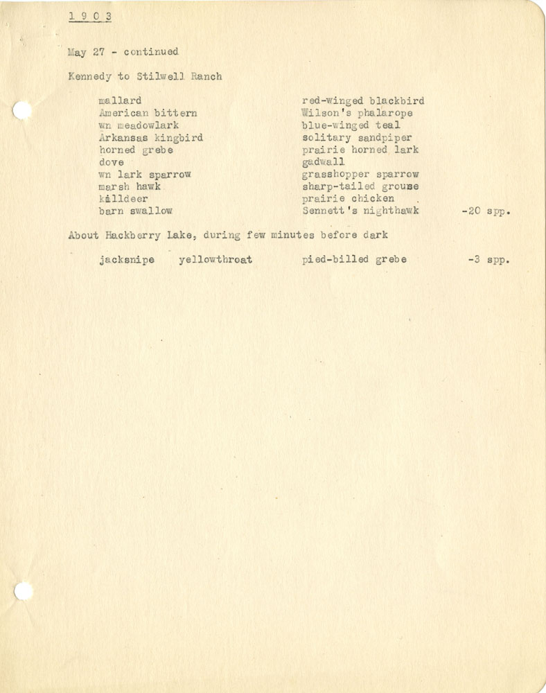 [2] May 27 - continued Kennedy to Stilwell Ranch mallard red-winged blackbird American bittern Wilson's phalarope wn meadowlark blue-winged teal Arkansas kingbird solitary sandpiper horned grebe prairie horned lark dove gadwall wn lark sparrow grasshopper sparrow marsh hawk sharp-tailed grouse killdeer prairie chicken barn swallow Sennett's nighthark -20 spp. About Hackberry Lark, during few minutes before drak jacksnipe yellowthroat pied-billed grebe -3 spp.