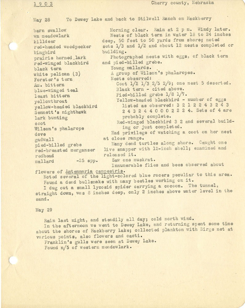 [4] Cherry county, Nebraska May 28 To Dewey Lake and back to Stilwell Ranch on Hackberry barn swallow Morning clear. Rain at 2 p.m. Windy later. wn meadowlark Nests of black tern in water 18 to 24 inches killdeer deep, 50 feet to 50 yards from shore; noted red-headed woodpecker sets 1/3 and 1/2 and about 12 nests completed or kingbird building. prairie horned lark Photographed nests with eggs, of black tern red-winged blackbird and pied-billed grebe. black tern Young mallards. white pelican (3) A group of Wilson's phalaropes Forster's tern Nests observed Am. bittern Coot 1/2 1/3 2/5 2/9; one nest 5 deserted. blue-winged teal Black tern - cited above. least bittern Pied-billed grebe 1/8 1/7. yellowthroat Yellow-headed blackbird - number of eggs yellow-headed blackbird listed as observed: 3 2 1 2 2 4 3 2 4 3 Sennett's nighthawk 2 4 3 2 4 4 0 0 0 2 2 2 4. Sets of 4 are lark bunting probably complete. coot Red-winged blackbird 3 2 and several building Wilson's phalarope or just completed. dove Had privilege of watching a coot on her nest gadwall at close range. pied-billed grebe Many dead turtles alon gshore. Caught one red-breasted merganser live snapper with 12-inch shell; examined and redhead released it. mallard -25 spp. Saw one musrat. Innumerable flies and bees observed about flowers of Antennaria campestris . Noted several of the light-colored blue racers peculiar to this area. Found a dead bullsnake with many beetles working on it. I dug out a small lycosid spider carrying a cocoon. The tunnel, straight down, was 8 inches deep, only 2 inches above water level in the sand. May 29 Rain last night, and steadily all day; cold north wind. In the afternoon we went to Dewey Lake, and returning spent some time about the shore of Hackberry lake; collected plankton with Birge net at various points, also flowers and cacti. Franklin's gulls were seen at Dewey Lake. Found n/5 of western meadowlark.