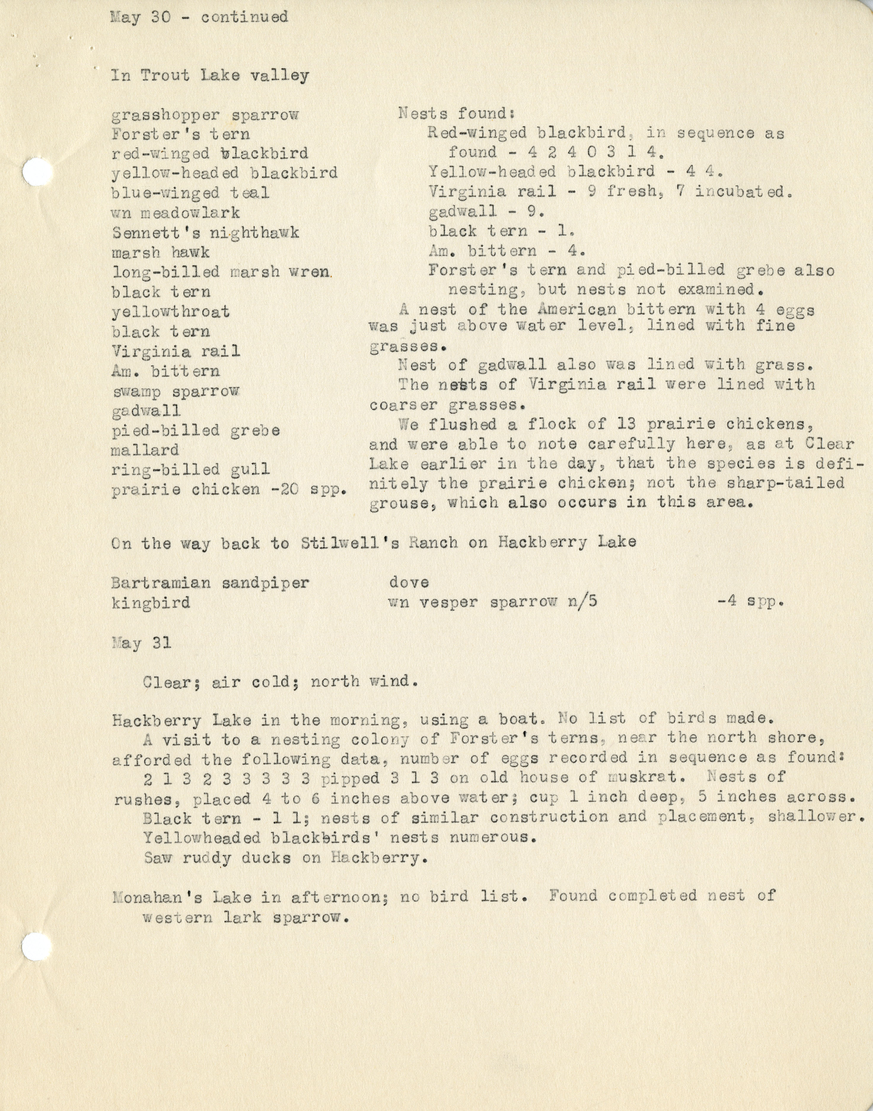 [6 ] May 30 -“ continued In Trout Lake valley grasshopper sparrow Nests found; Forster's tern Red-winged blackbird in sequence as red-winged blackbird found -4 2 4 0 3 1 4, yellow-headed blackbird yellow-headed blackbird - 4 4 blue-winged teal Virginia rail -9 fresh, 7 incubated wn meadowlark gadwall - 9. Sennett's nighthawk black tern - 1. marsh hawk Am. bittern - 4. long-billed marsh wren Forster's tern and pied-billed grebe also black tern nesting, but not examined. yellowthroat A nest of the American bittern with 4 eggs black tern was just above water level, lined with fine Virginia rail grasses Am. bittern Nest of gaswall also was lined with grass. swamp sparrow The nests of Virginia rail were lined with gadwall coarser grasses. pied-billed grebe We flushed a flock of 13 prairie chickens mallard and were able to note carefully here, as at Clear ring-billed gull Lake earlier in the day, that the species is defi- prairie chicken -20 spp. nitely the prairie chicken; not the sharp-tailed grouse, which also occurs in this area. On the way back to Stilwell's Ranch on Hackberry Lake Bartramian sandpiper dove kingbird wn vesper n/5 -4 spp. May 31 Clear; air cold; north wind. Hackberry Lake in the morning, using a boat. No list of birds made. A visit to a nesting colony of Forster's terns near the north shore, afforded the following data, number of eggs recorded in sequence as found: 2 1 3 2 3 3 3 3 3 pipped 3 1 3 on old house of muskrat. Nests of rushes, placed 4 to 6 inches above water; cup [sic] 1 inch deep, 5 inches across. Black tern - 1 1; nests of similar construction and placement, shallower. Yellowheaded blackbirds' nests numerous. Saw ruddy ducks on Hackberry. Monahan's Lake in afternoon; no bird list. Found completed nest of western lark sparrow.
