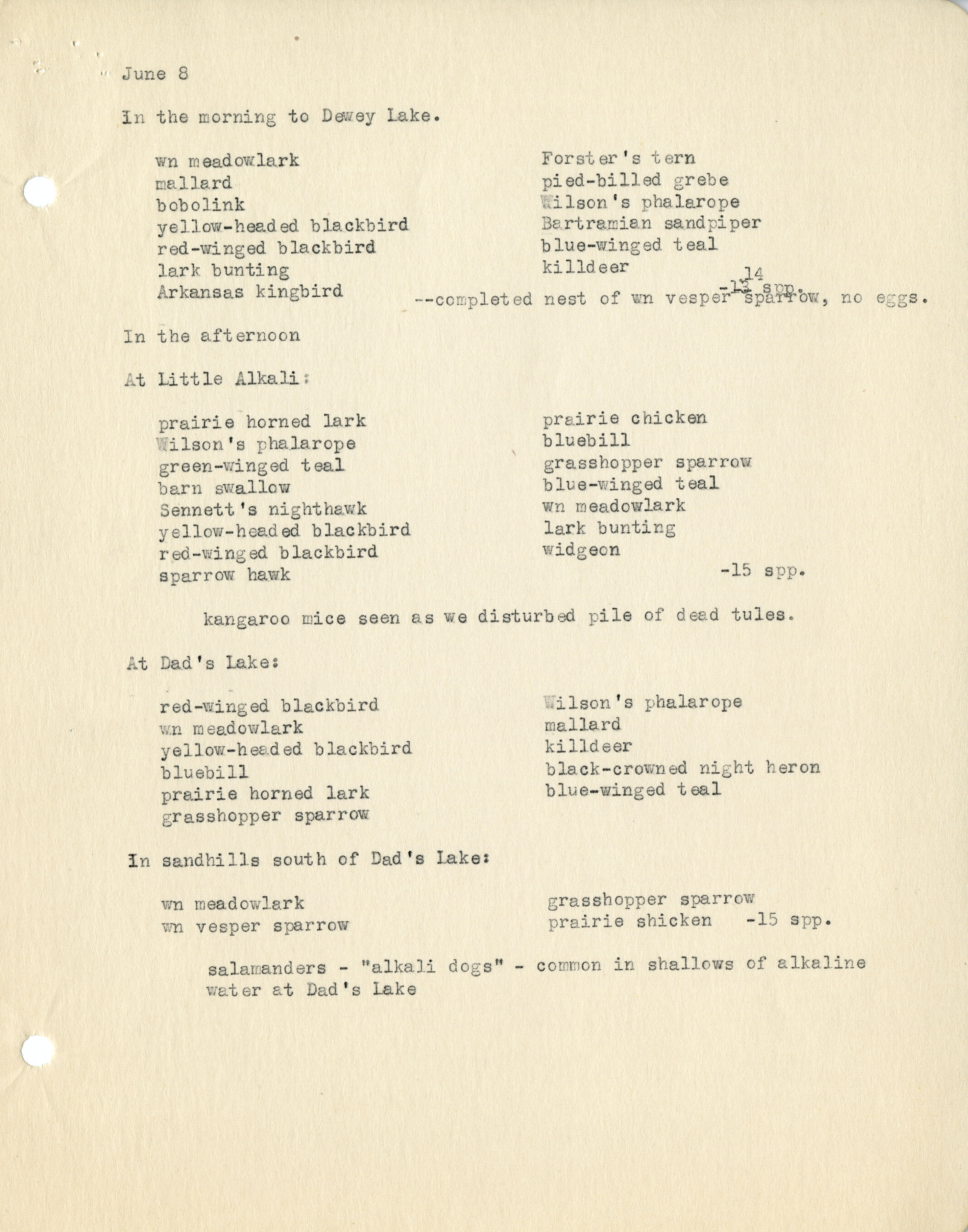 [12 ] June 8 In the morning to Dewey Lake wn meadowlark Forster's tern mallard pied-billed grebe bobolink Wilson's phalarope yellow-headed blackbird Bertramian sandpiper red-winged blackbird blue-winged teal lark bunting killdeer Arkansas kingbird -13 14 spp. -completed nest of wn vesper sparrow, no eggs. In the afternoon At Little Alkali: prairie horned lark prairie chicken Wilson's phalarope bluebill green-winged teal grasshopper sparrow barn swallow blue-winged teal Sennett's nighthawk wn meadowlark yellow-headed blackbird lark bunting red-winged blackbird widgeon sparrow hawk -15 spp. kangaroo mice seen as we disturbed pile of dead tules. At Dad's Lake red-winged blackbird Wilson's phalarope wn meadowlark mallard yellow-heded blackbird killdeer bluebill black-crowned night heron prairie horned lark blue-winged teal grasshopper sparrow In sandhills south of Dad's Lake: wn meadowlark grasshopper sparrow wn vesper sparrow prairie chicken -15 spp. salamanders - "alkali dogs" - common in shallows of alkaline water at Dad's Lake