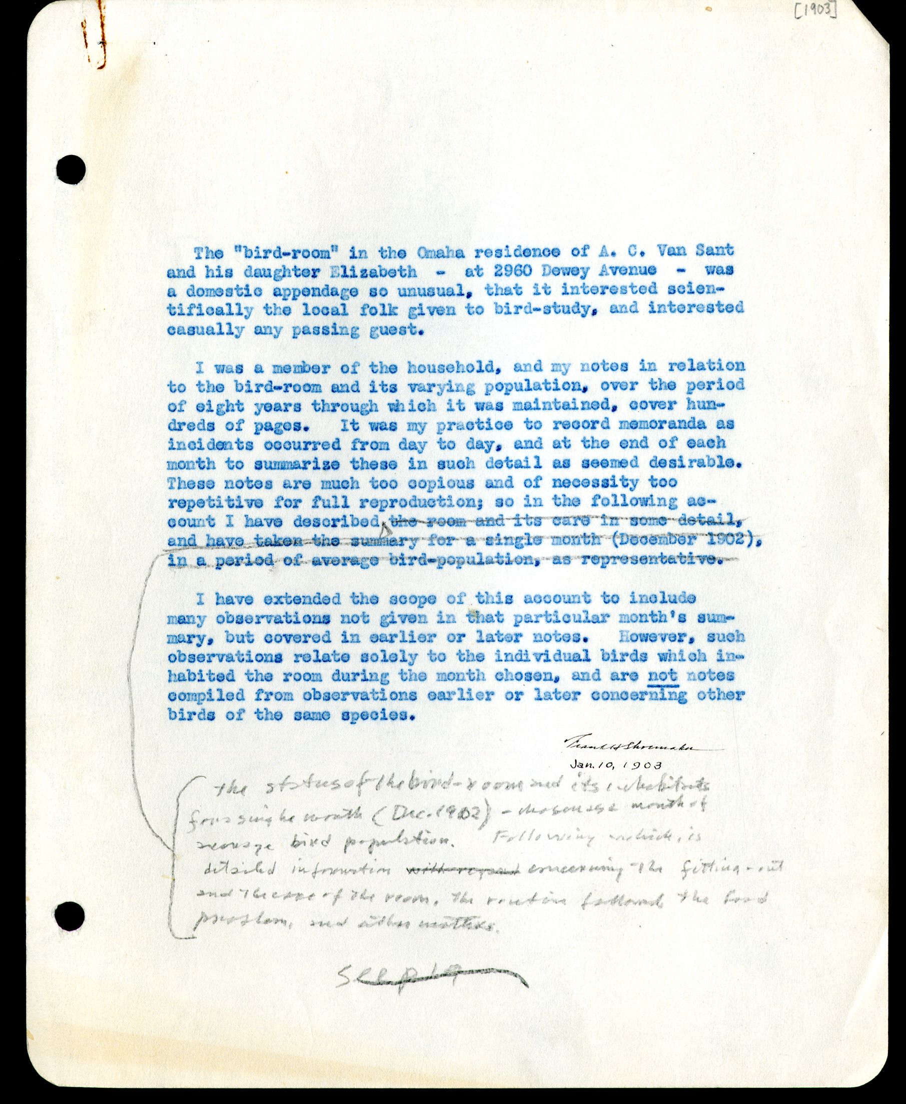 [Page 2] The "bird-room" in the Omaha residence of A.C. Van Sant and his daughter Elizabeth -at 2960 Dewey Avenue -was a domestic appendage so unusual, that it interested scientifically the local folk given to bird-study, and interested casually any passing guest. I was a member of the household, and my notes in relation to the bird-room and its varying population, over the period of eight years through which it was maintained, cover hundreds of pages. It was my practice to record memoranda as incidents occurred from day to day, and at the end of each month to summarize these in such detail as seemed desirable. These notes are much too copious and of necessity too repetitive for full reproduction; so in the following account I have described the room and its care in some detail, and have taken the summary for a single month (December 1902), in a period of average bird-population, as representative. I have extended the scope of this account to include many observations not given in that particular month's summary, but covered in earlier or later notes. However, such observations relate solely to the individual birds which inhabited the room during the month chosen, and are not notes compiled from observations earlier or later concerning other birds of the same species. [signature] Frank Shoemaker Jan 10, 1908 [longhand, to replace the section crossed out] the status of the bird-room and its inhabitants from [illegible] month (Dec. 1902) -[illegible] month of average bird population. Following which is detailed information with respect concerning the [illegible] and the [illegible] of the room. The reaction followed the [illegible] and other [illegible] Sep 19