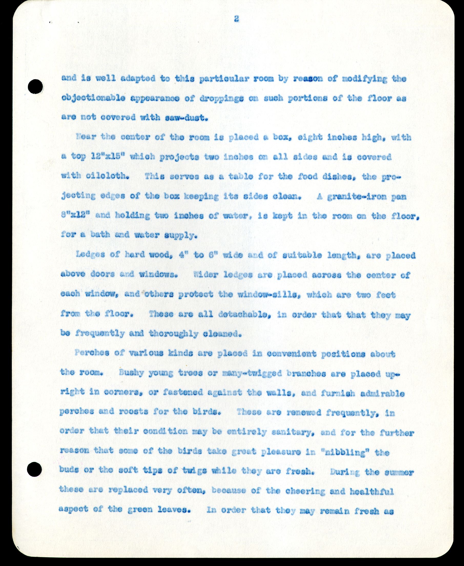 [Page 4] 2 and is well adapted to this particular room by reason of modifying the objectionable appearance of droppings on such portions of the floor as are not covered with saw dust. Near the center of the room is placed a box, eight inches high, with a top 12"x15" which projects two inches on all sides and is covered with oilcloth. This serves as a table for the food dishes, the projecting edges of the box keeping its sides clean. A granite-iron pan 8"x12" and holding two inches of water, is kept in the room on the floor, for a bath and water supply. Ledges of hard wood, 4" to 6" wide and of suitable length, are placed above doors and windows. Wider ledges are placed across the center of each window, and others protect the window-sills, which are two feet from the floor. These are all detachable, in order that that they may be frequently and thoroughly cleaned. Perches of various kinds are placed in convenient positions about the room. Bushy young trees or many twigged branches are placed upright in corners, or fastened against the walls, and furnish admirable perches and roosts for the birds. These are renewed frequently, in order that their condition may be entirely sanitary, and for the further reason that some of the birds have taken great pleasure in "nibbling" the buds or the soft tops of twigs while they are fresh. During the summer these are replaced very often, because of the cheering and healthful aspect of the green leaves. In order that they may remain fresh as