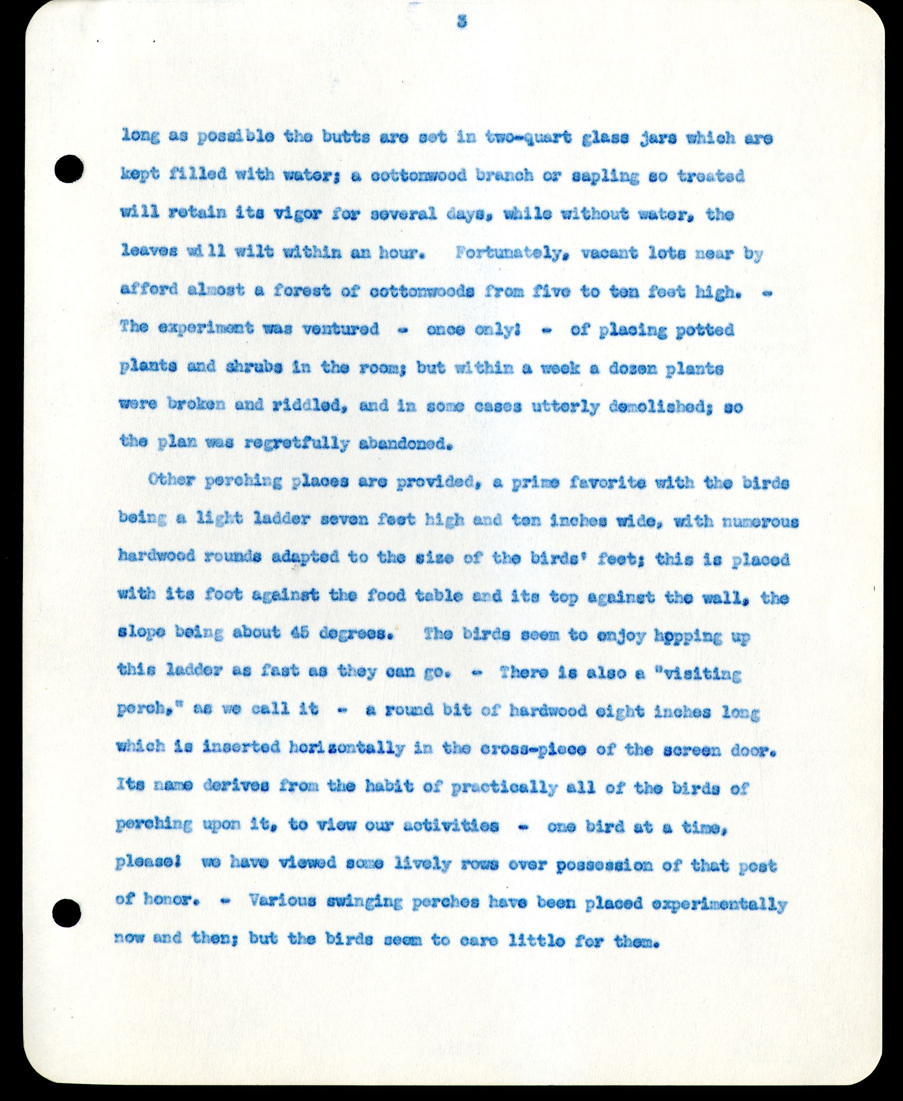 [Page 5] 3 long as possible the butts are set in two-quart glass jars which are kept filled with water; a cottonwood branch or sapling so treated will retain its vigor for several days, while without water, the leaves will wilt within an hour. Fortunately, vacant lots near by afford almost a forest of cottonwoods from five to ten feet high. -The experiment was ventured -once only! -of placing potted plants and shrubs in the room; but within a week a dozen plants were broken and riddled, and in some cases utterly demolished; so the plan was regretfully abandoned. Other perching places were provided, a prime favorite with the birds being a light ladder seven feet high and ten inches wide, with numerous hardwood rounds adapted to the size of the birds' feet; this is placed with its foot against the food table and its top against the wall, the slope being about 45 degrees. The birds seem to enjoy hopping up this ladder as fast as they can go. -There is also a "visiting porch," as we call it -a round bit of hardwood eight inches long which is inserted horizontally in the cross-piece of the screen door. Its name derives from the habit of practically all of the birds of perching upon it, to view our activities -one bird at a time, please! We have viewed some lively rows over possession of that post of honor. -Various swinging perches have been placed experimentally now and then, but the birds seem to care little for them.