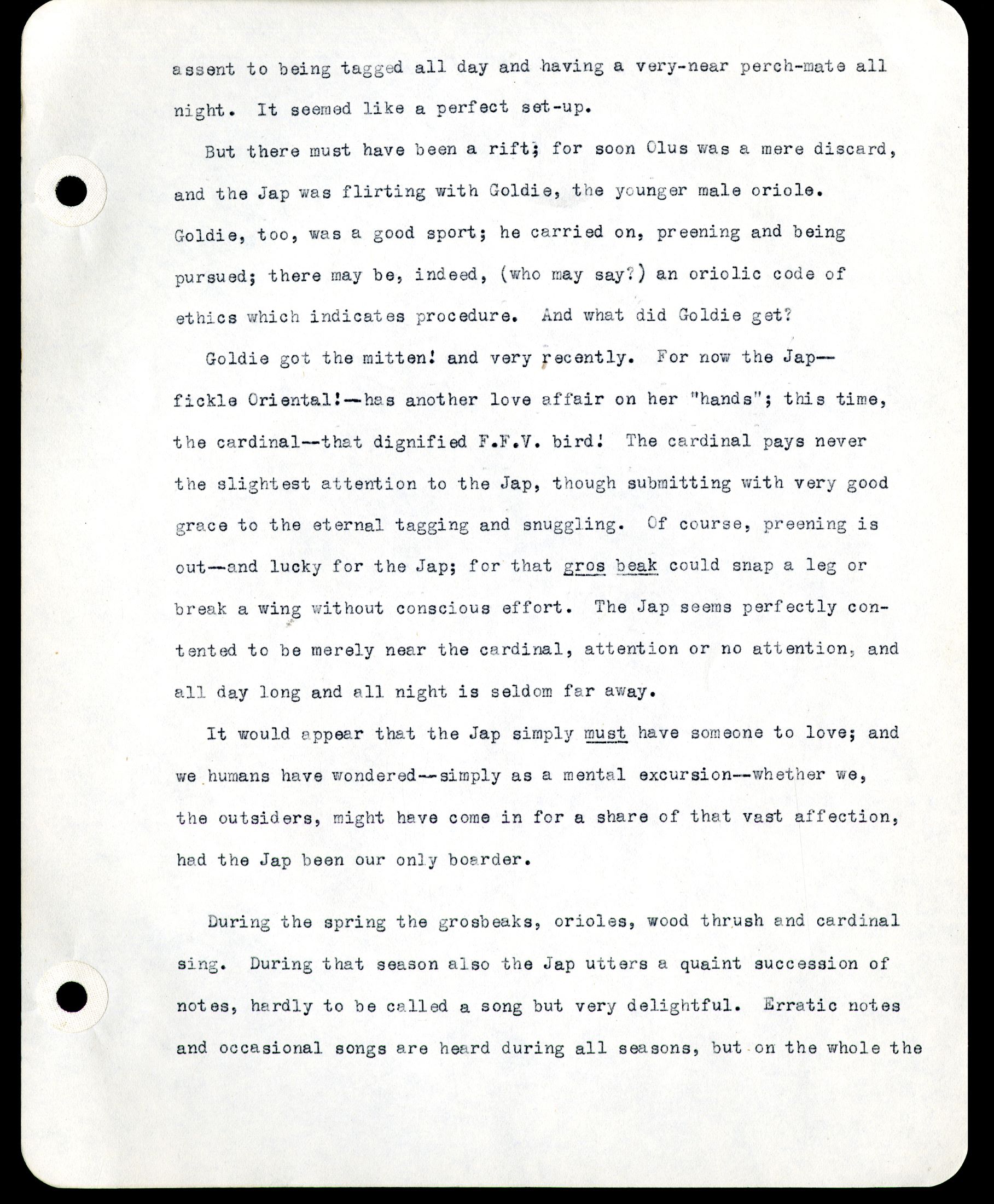 [Page 17] knowledge. However, he never indulges in the springtime whistle which leads each March, or earlier, to the excited report from the ornithologically untrained that the "phoebe" is back. The nest from which he came was in a shrubbery on premises near by, and he is the surviving member of a family of five young, cats having gotten the rest and the parent birds as well, according to the friend who rescued him. Our "Japanese robin" is a problem. That is the bird-store name of the bird; but -or therefore -neither part of it may be correct. She may be anything but a Japanese bird, and she is surely anything but a bird which could be classified as a robin of our ken. That sentence is frightfully mixed; but so is the subject. However, she is a dainty little creature, somewhat smaller than our sparrows, with coral bill, a beautiful plumage of gray and gray-green, with touches of red and yellow on the wings. We bought the bird in a pet shop about 15 months ago. From the beauty of its plumage we considered it for months a male bird; but one day in a bird-store we saw and heard a male of the same species -a "Japanese robin," we were enlighteningly told. The bird was slightly larger than ours, and its notes definitely stronger, though the remarks were identical as were also the pattern and color of the plumage. So we were finally convinced that our bird is a female.