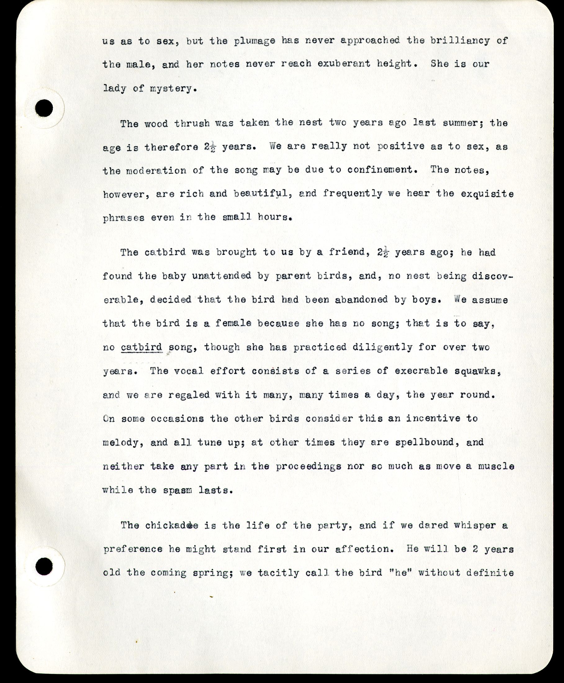 [Page 22] can see but can not reach the seeds. He makes careful survey, peering and pecking, sometimes waiting pensively thereafter for me to behave. And if I don't, his action is energetic, and effective; he pounds fiercely at the base of a finger-nail, at the precise point where it will hurt worst -and you bet I open up! I have actually had finger-nails grow out with battle-scars to remind me of the times when I indiscreetly picked on a little feller weighing less than a half-ounce. He is very fond of fat meat, eating much of it and stowing away a supply in every cranny about the room -in cracks, in sharp angles of branches, under strips of loosened bark. He even stuffs the key-hole of the hall door with suet and seeds. Obviously he has a keen instinct to provide against a period of stress; but as no hard times have arrived in his life he never uses his surplus; he simply keeps on hoarding. He has never developed the full, mature, "chickadee-dee-dee" note, and never has been heard giving the characteristic spring whistle. The orioles walk all over us and abuse us outrageously, hammering our fingers and ears, prying our fingers apart, prying everywhere. Their bills are so sharp that a blow is not quite an unmixed joy; but we got back for more. The "prying" of the orioles is characteristic. The muscles which close the bill seem much weaker than those which open it, and it is surprising how much strength is shown in forcing our fingers apart