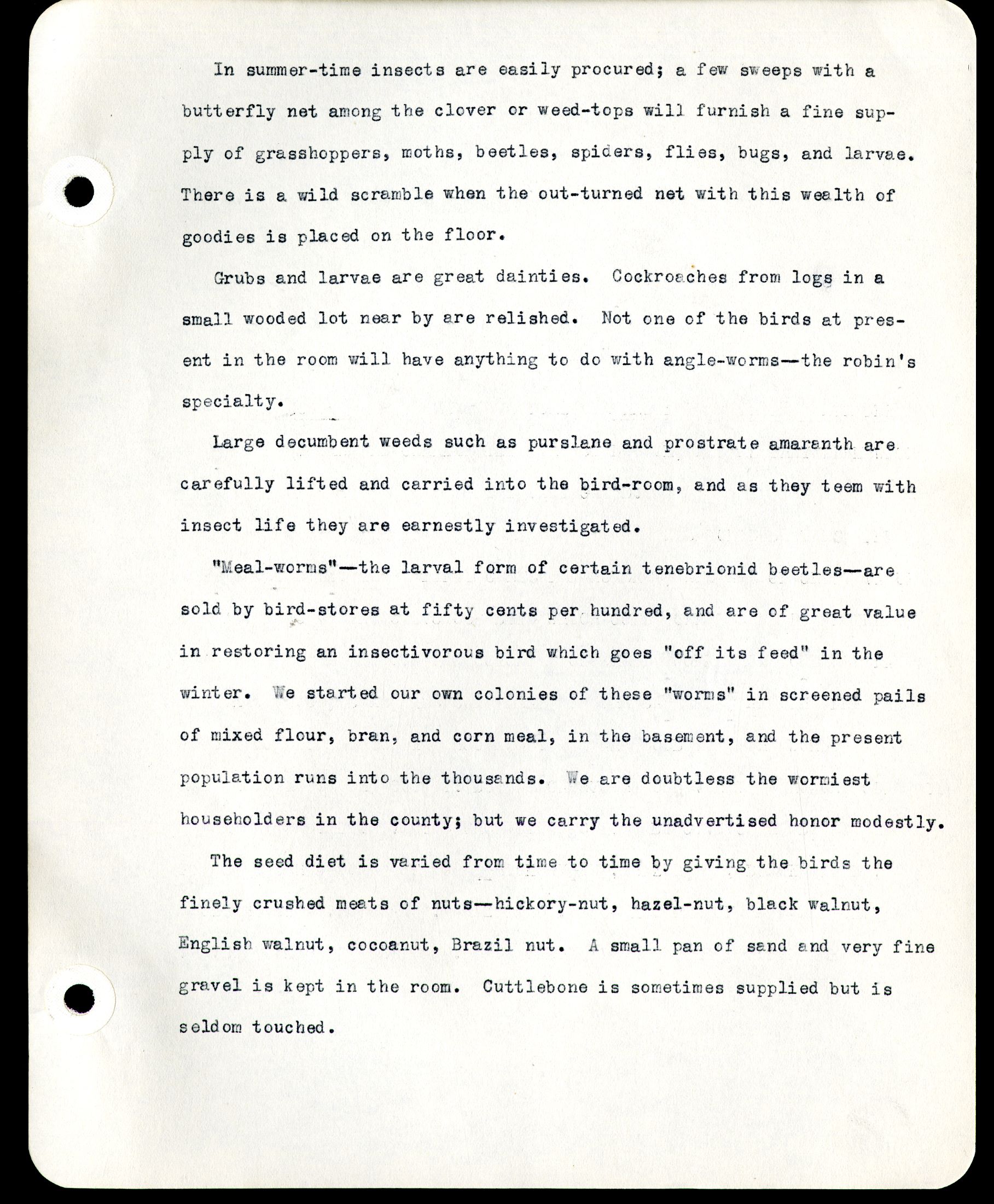 [Page 25] The grosbeaks bathe lustily in warm weather, but with scandalous infrequency in winter. The cardinal, chickadee, and catbird keep it up the year round. The orioles are not enthusiastic about winter bathing, but are through when once they start; they and the grosbeaks assume grotesque attitudes in the sunshine to dry their feathers. The sparrows are indifferent about bathing; regular dirty boys. Association or companionship among the birds is confined chiefly to "specific" lines. The two grosbeaks are constantly together. The two sparrows spend most of their time visiting each other, talking at the top of their voices, and occasionally picking up acquaintance with outside sparrows through the screen. The two orioles are good friends when they are not chasing each other and pulling feathers, but seem to care less for each other than either of the other pairs. As to friendships between birds not related by the tie of species, these are varied and fitful. The catbird and the wood thrush have a seeming affection for each other, after a fashion, but it often takes the form of feather-pulling and downright meanness. First one has the leadership and then the other; they spend much time on the floor bowing and ducking to each other at close range, until it is difficult to say whether one is observing a minuet or a sparring match. And this is where the Jap takes the spotlight. She is the most affectionate bird in the room; but very, very fickle. Her first