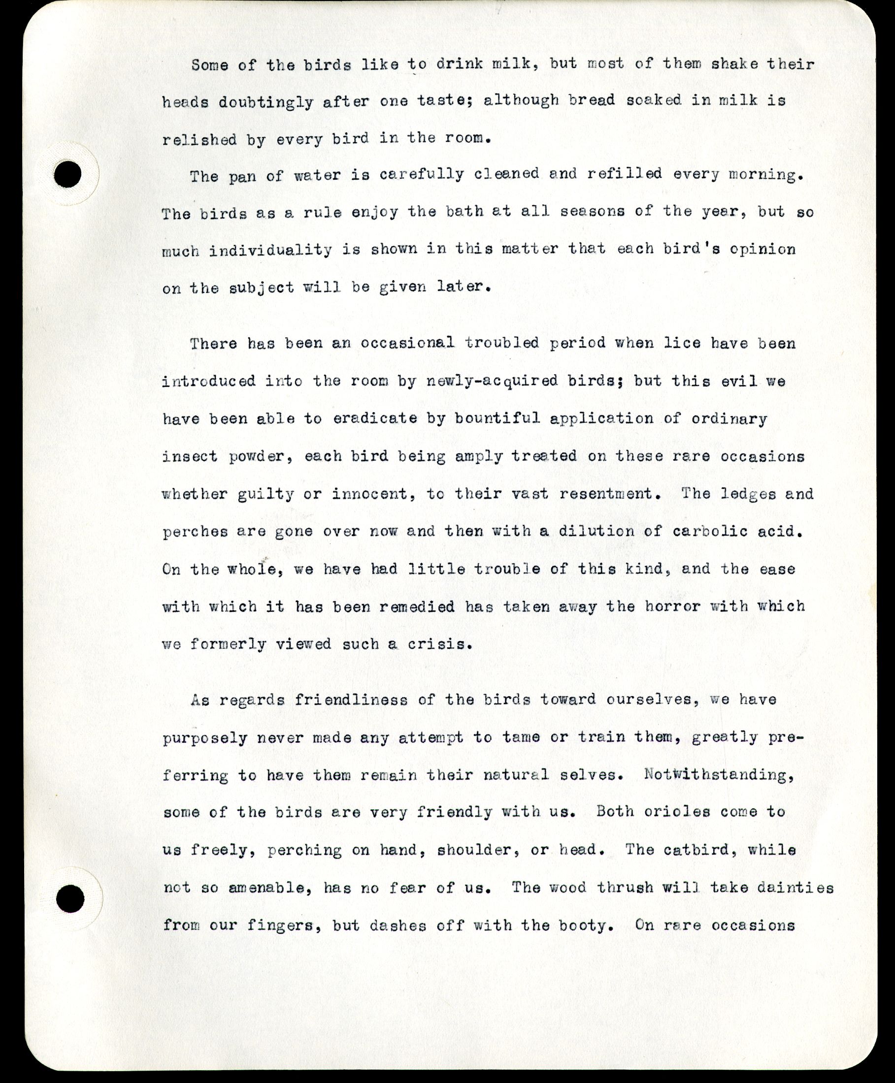[Page 26] violent love was for Origold, a female Baltimore oriole which we released last summer because of an irritated condition of the feet which did not yield to our treatment, and which we believed might be cured by restoration to her normal habitat. It seemed as though the Jap could never love the oriole hard enough; almost the entire day she followed the oriole about, and every night was spent snuggled close to her side. Nothing gave the Jap more heavenly joy than to have Origold preen her (the Jap's) feathers, and for some strange reason the oriole made this her frequent duty or pleasure. During this process the Jap would sit with closed eyes -feathers ruffled, bill upturned, a picture of happiness -while Origold pried around among the feathers on her head and back. Sometimes Origold was a trifle rough in her caresses; then the Jap would give a little start, as though awakening, shake her head violently, and hop a few inches away, only to renew her attentions to the oriole the next minute and again experience the ecstasy of having her feathers preened. The Jap has a lovely little under-the-breath note which she utters constantly during these ministrations. One of the saddest features of releasing Origold was the breaking off of this long-established friendship. However, not a week after Origold's release, to our satisfaction and amusement the Jap took a violent fancy for Olus, the male oriole. And Olus, being a perfect gentleman, took over the active job of giving a Japanese lady a massage ten times a day; and gave passive