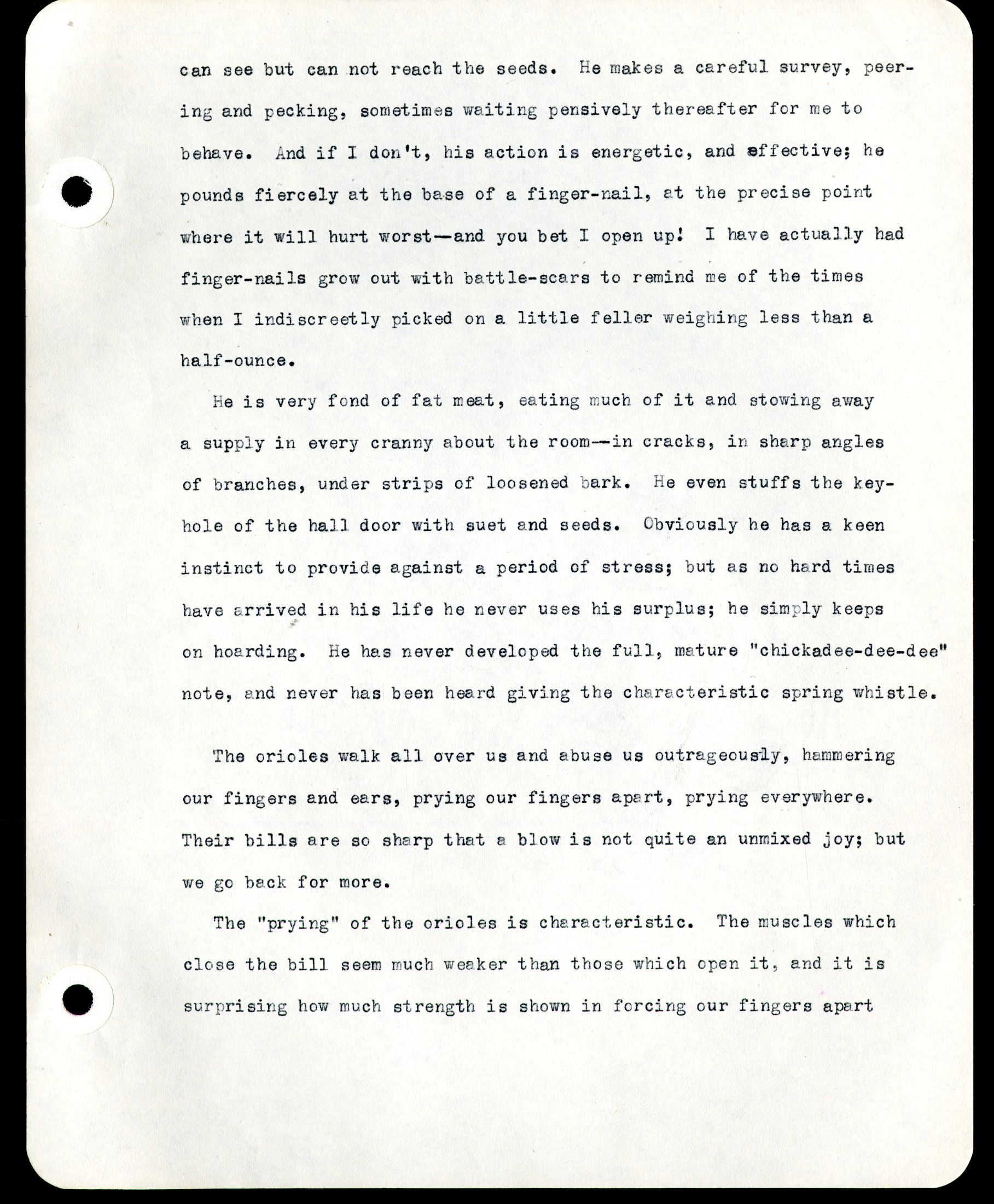[Page 28] birds are silent except in the spring and early summer. The Jap will always answer when we whistle a poor imitation of her notes. Too, this comment as to seasonal silence must be sensed as excluding the sparrows, who (thank goodness) chatter the year round; and also the catbird, who, though not musical, would like to be, and practices twelve or thirteen months each year. Birds from outside are frequently attracted to the windows by the notes of our little group, but not often and species except the ever-present sparrows, which visit often. On one occasion, on a mild winter day when the windows were open, a shrike dashed against the screen with such force that he was almost disabled; doubtless he had caught a glimpse of one of our birds. Once, a week after the release of Origold, she came to the window for a visit; but we never saw her again. - The dimensions of the bird-room are 11 feet by 7 feet 9 inches. It is on the ground floor of the residence, with an east door opening upon the dining-room and a south door opening upon the front hall; but the latter is never opened. The door opening upon the dining-room is open practically all of time; a light screen door fitted to the casing serves to keep the birds separated from the rest of us. Two large windows separated only by the upright needful to support the frames open to the west; these afford a light source 5'2"x5'9", and a ventilation area one-half as large, as the windows are left in place for protection during unfavorable weather. The house being at