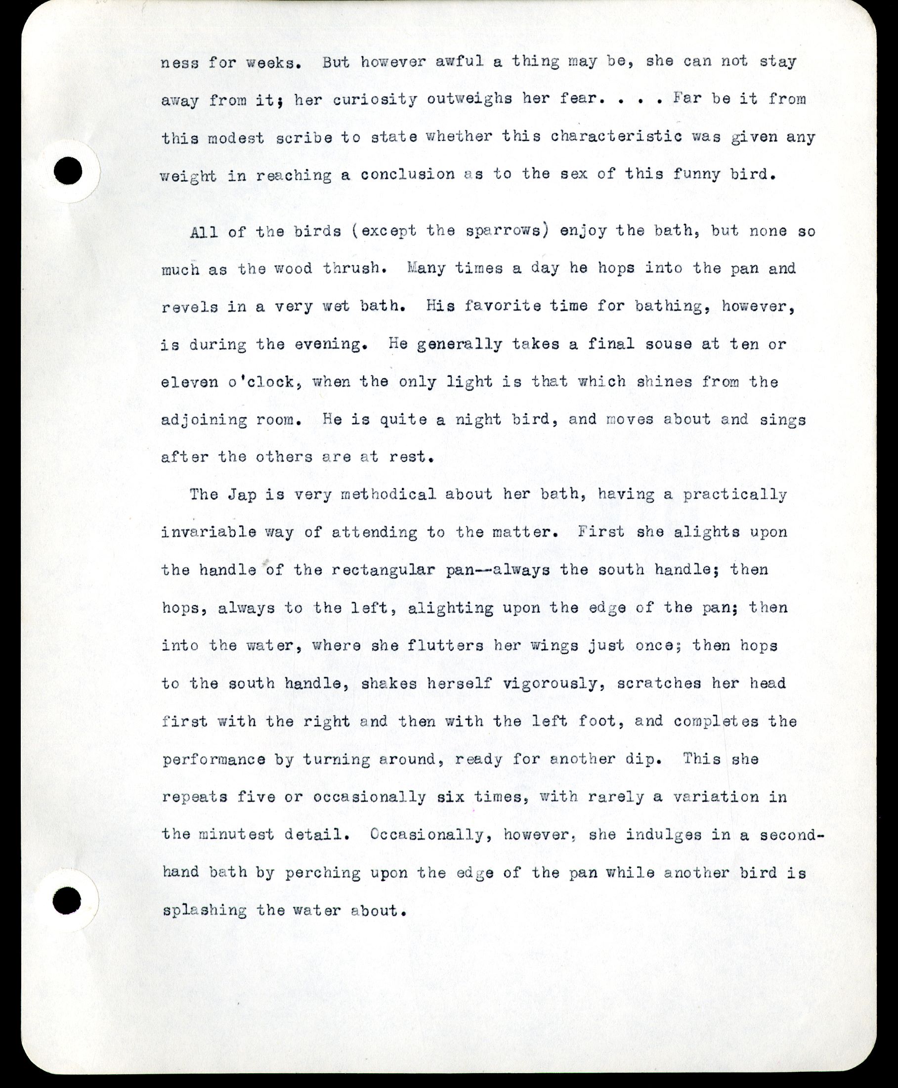[Page 30] center of each window, and others protect the window-sills, which are two feet from the floor. These are all detachable, in order that they may be frequently and thoroughly cleaned. Perches of various kinds are placed in convenient positions about the room. Bushy young trees or many-twigged branches are placed upright in corners, or fastened against the walls, furnishing admirable perches and roosts for the birds. These are renewed often, in order that their condition may be sanitary, and for the further reason that some of the birds take great pleasure in "nibbling" the buds of the soft tips of twigs while they are fresh. During the summer these are replaced very frequently, because of the cheering and healthful aspect of the green leaves. In order that they may remain fresh as long as possible the butts are set in two-quart jars which are kept filled with water. A cottonwood branch or sapling so treated with retain its vigor for several days, though without water the leaves will wilt within an hour. Fortunately, vacant lots westward afford almost a forest of cottonwoods from five to ten feet high. The experiment was ventured, of placing potted plants and shrubs in the room; but within a week a dozen plants were broken and riddled, in some cases utterly demolished; so the plan was regretfully abandoned. Other perching places are provided a prime favorite with the birds being a light ladder seven feet high and ten inches wide, with numerous hardwood rounds adapted to the size of the birds' feet; this is placed with its foot against the food table and its top against the wall, the