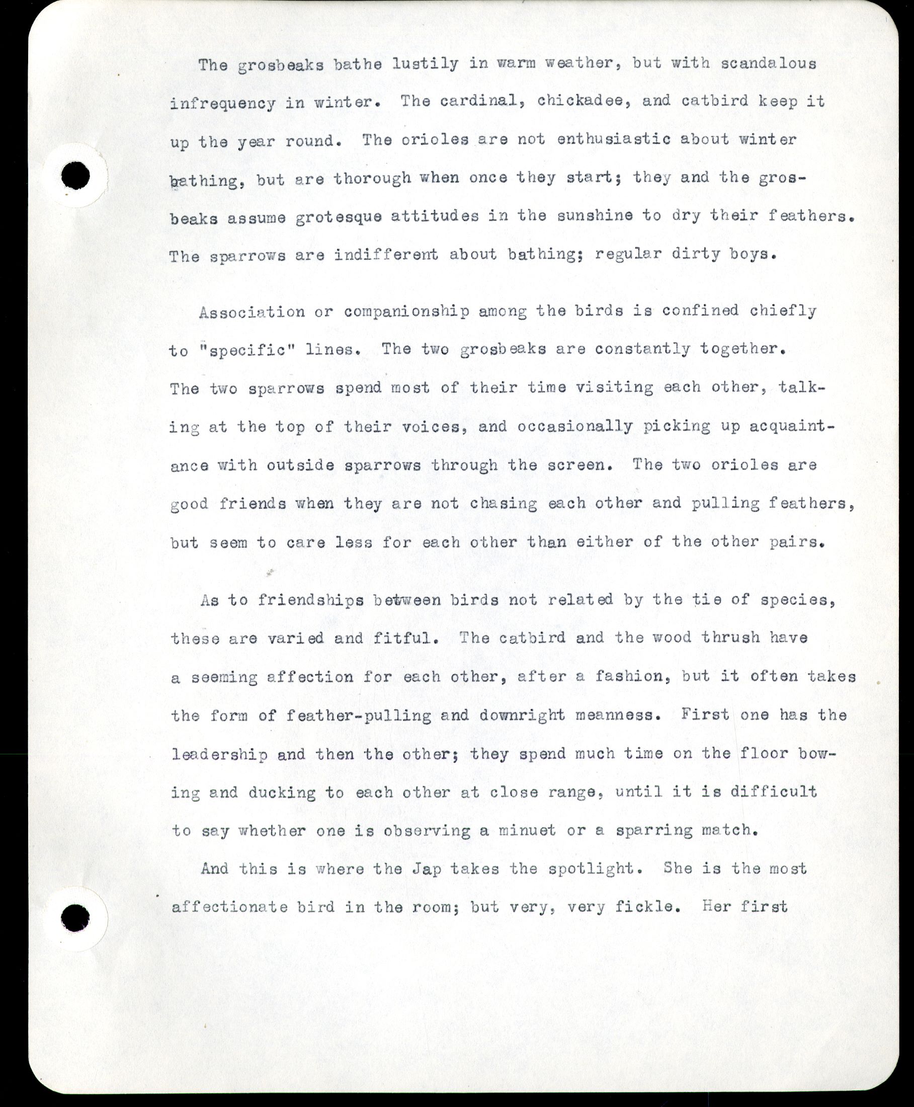 [Page 31] slope being about 45 degrees. The birds enjoy hopping up this ladder as fast as they can go. There is also a "visiting perch," as we call it -a round bit of hardwood eight inches long which is inserted horizontally in the cross-piece of the screen door. Its name derives from the habit of all of the birds, of perching upon it to view our human activities in the adjoining room. We have viewed some lively rows over possession of that perch of honor. -Various swinging perches have been placed experimentally now and then; but the birds seem to care little for them. Over the greater part of the floor we keep a layer of coarse sawdust, which is changed often. We have devised a means of screening this sawdust, so when placed on the floor it is practically free from floating dust. This protects the floor and makes the frequent cleaning much easier. The floor is scrubbed once each week, and the walls are gone over with a damp cloth. Aside from the free circulation of air afforded by the large and generally wide-open windows, special ventilation of the room is provided by a pipe to the furnace flue; this is useful particularly in the winter season. Light for night use when desirable is furnished by a drop cord in the center of the room with a 100-watt bulb.