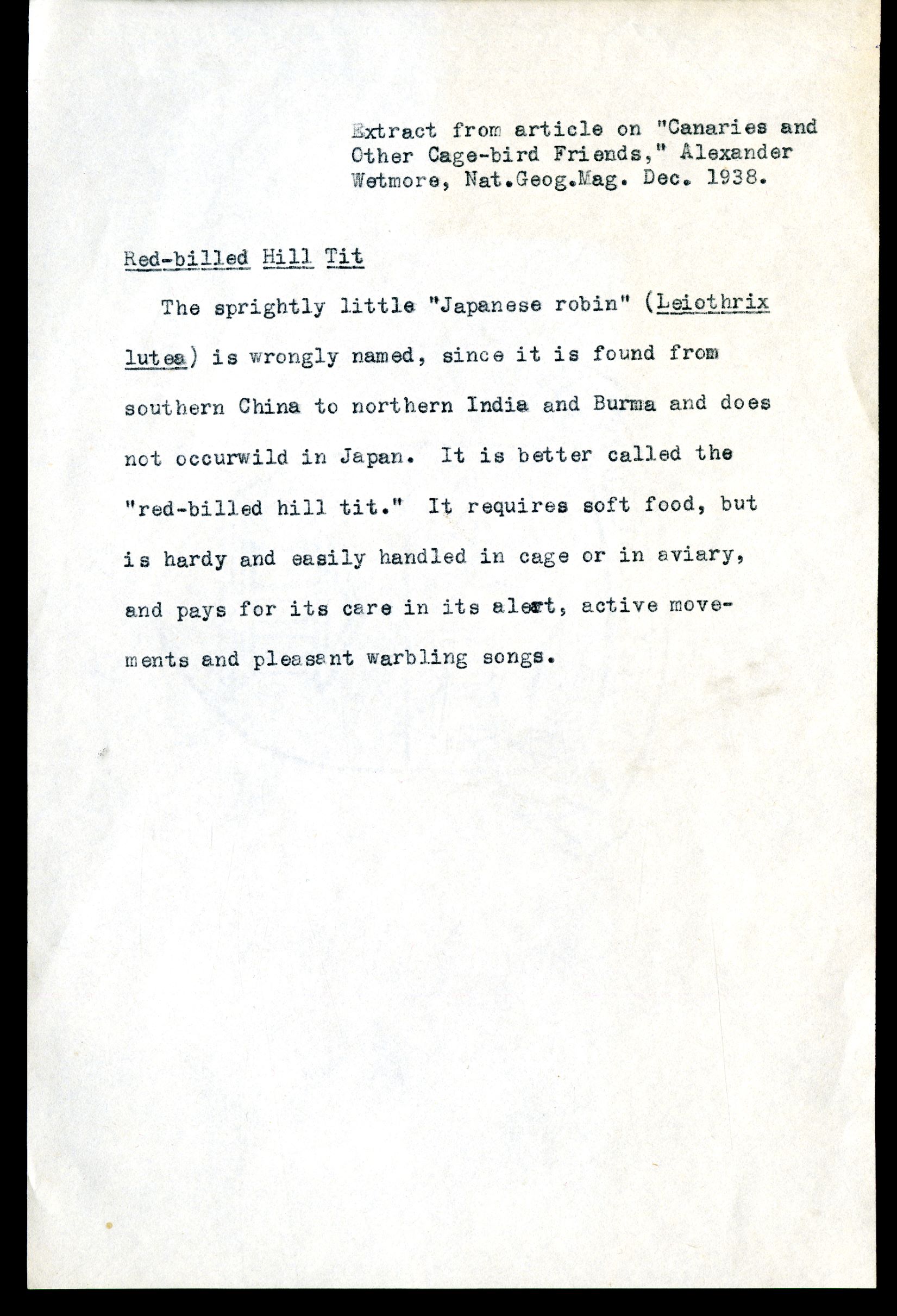 [Page 32] Extracted from article on "Canaries and Other Cage-bird Friends," Alexander Wetmore, Nat. Geog.Mag. Dec. 1938 Red-billed Hill Tit The slightly little "Japanese robin" (Leiothrix) lute) is wrongly named, since it is found from southern China to northern India and Burma and does not occur wild in Japan. It is better called the "red-billed hill tit." It requires soft food, but is hardy and easily handled in cage or in aviary, and pays for its care in its alert, active movements and pleasant warbling songs.