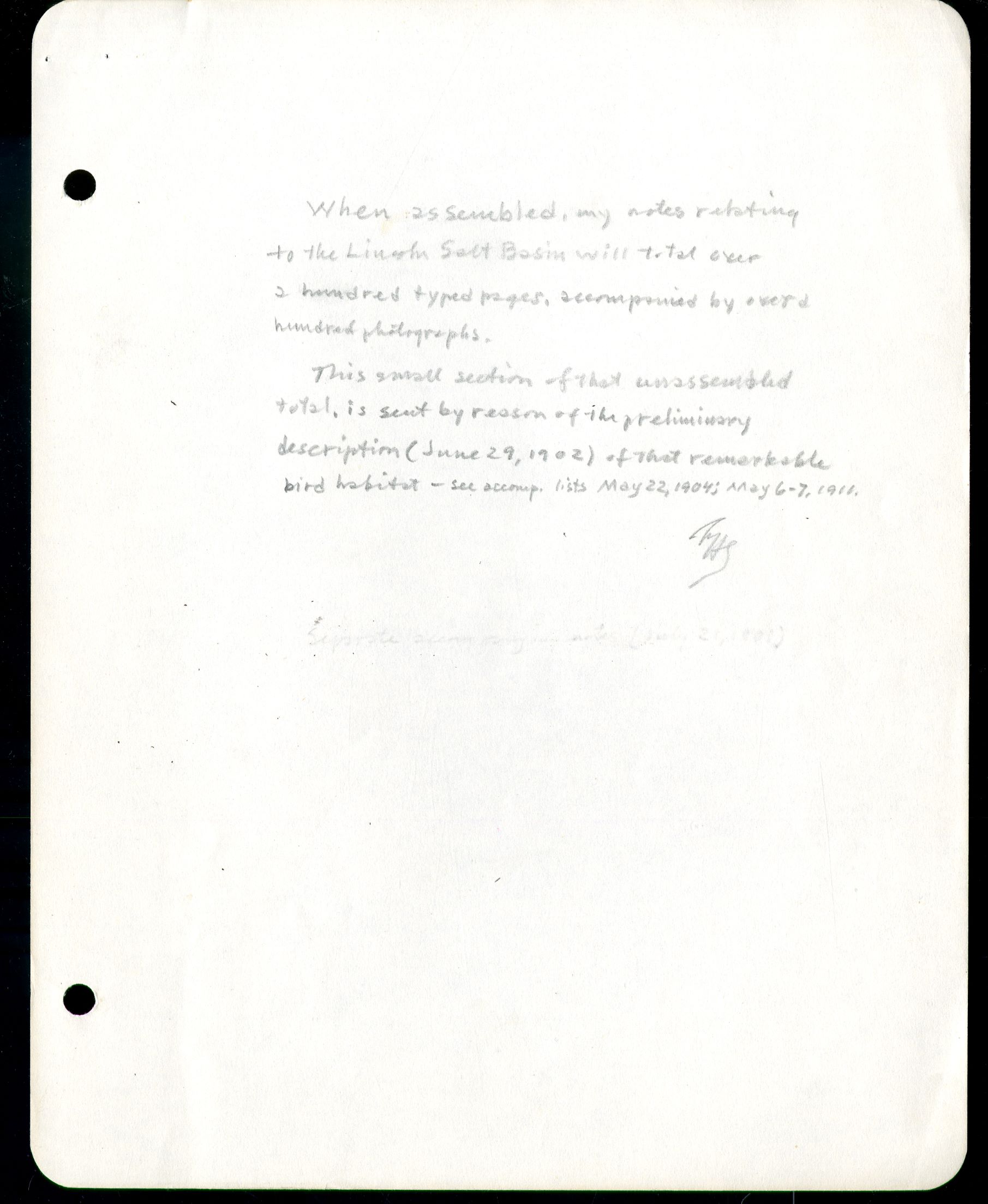When assembled, my notes relating to the Lincoln Salt Basin will total over a hundred typed pages, accompanied by over a hundred photographs. This small section of that unassembled total, is sent by reason of the preliminary description (June 29 1902) of that remarkable bird habitat - see accomp. lists May 22, 1904; May 6-7, 1911