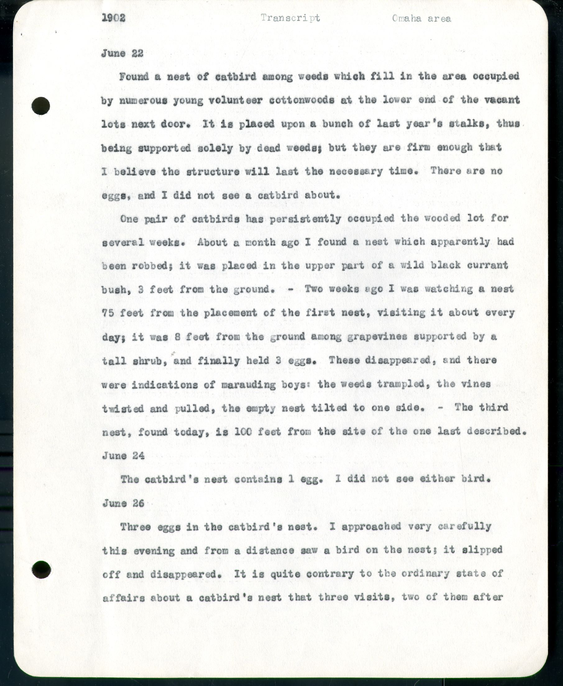 1902 Transcript Omaha area June 22 Found a nest of catbird among weeds which fill in the area occupied by numerous young volunteer cottonwoods at the lower end of the vacant lots next door. It is placed upon a bunch of last year's stalks, thus being supported solely by dead weeds; but they are firm enough that I believe the structure will last the necessary time. There are no eggs, and I did not see a catbird about. One pair of catbirds has persistently occupied the wooded lot for several weeks. About a month ago I found the nest which apparently had been robbed; it was placed in the upper part of a wild black currant bush, 3 feet from the ground. - Two weeks ago I was watching a nest 75 feet from the placement of the first nest, visiting it about every day; it was 8 feet from the ground among grapevines supported by a tall shrub, and finally held 3 eggs. These disappeared, and there were indications of marauding boys: the weeds trampled, the vined twisted and pulled, the empty nest tilted to one side. - The third nest, found today, is 100 feet from the site of the last one described. June 24 The catbird's nest contains 1 egg. I did not see either bird. June 26 Three eggs in the catbird's nest. I approached very carefully this evening and from a distance saw a bird on the nest; it slipped off and disappeared. It is quite contrary to the ordinary state of affairs about a catbird's nest that three visits, two of them after
