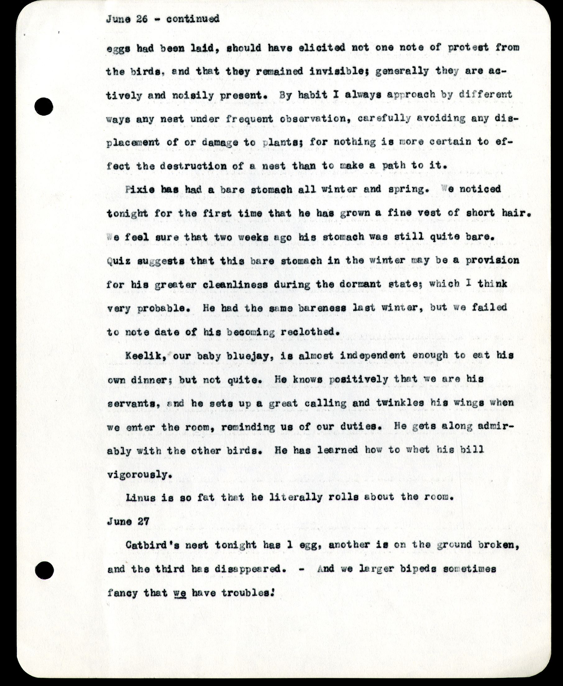 eggs had been laid, should have elicited not one note of protest from the birds, and that they remained invisible; generally they are actively and noisily present. By habit I always approach by different wats any nest under frequent observation, carefully avoiding any displacement of or damage to plants; for nothing is more certain to effect the destruction of a nest than to make a path to it. Pixie has had a bare stomach all winter and spring. We noticed tonight for the first time that he has grown a fine vest of short hair. We feel sure that two weeks ago his stomach was still quite bare. Quiz suggests that this bare stomach during the winter may be a provision for his greater cleanliness during the dormant state; which I think very probable. He had the same bareness last winter, but we failed to note the date of his becoming reclothed. Keelik, our baby bluejay, is almost independent enough to eat his own dinner; but not quite. He knows positively that we are his servants, and he sets up a great calling and twinkles his wings when we enter the room, reminding us of our duties. He gets along admirably with the other birds. He has learned how to whet his bill vigorously. Linus is so fat that he literally rolls about the room. June 27 Catbird's nest tonight has 1 egg, another is on the ground broken, and the third has disappeared. - And we larger bipeds sometimes fancy that we have troubles!