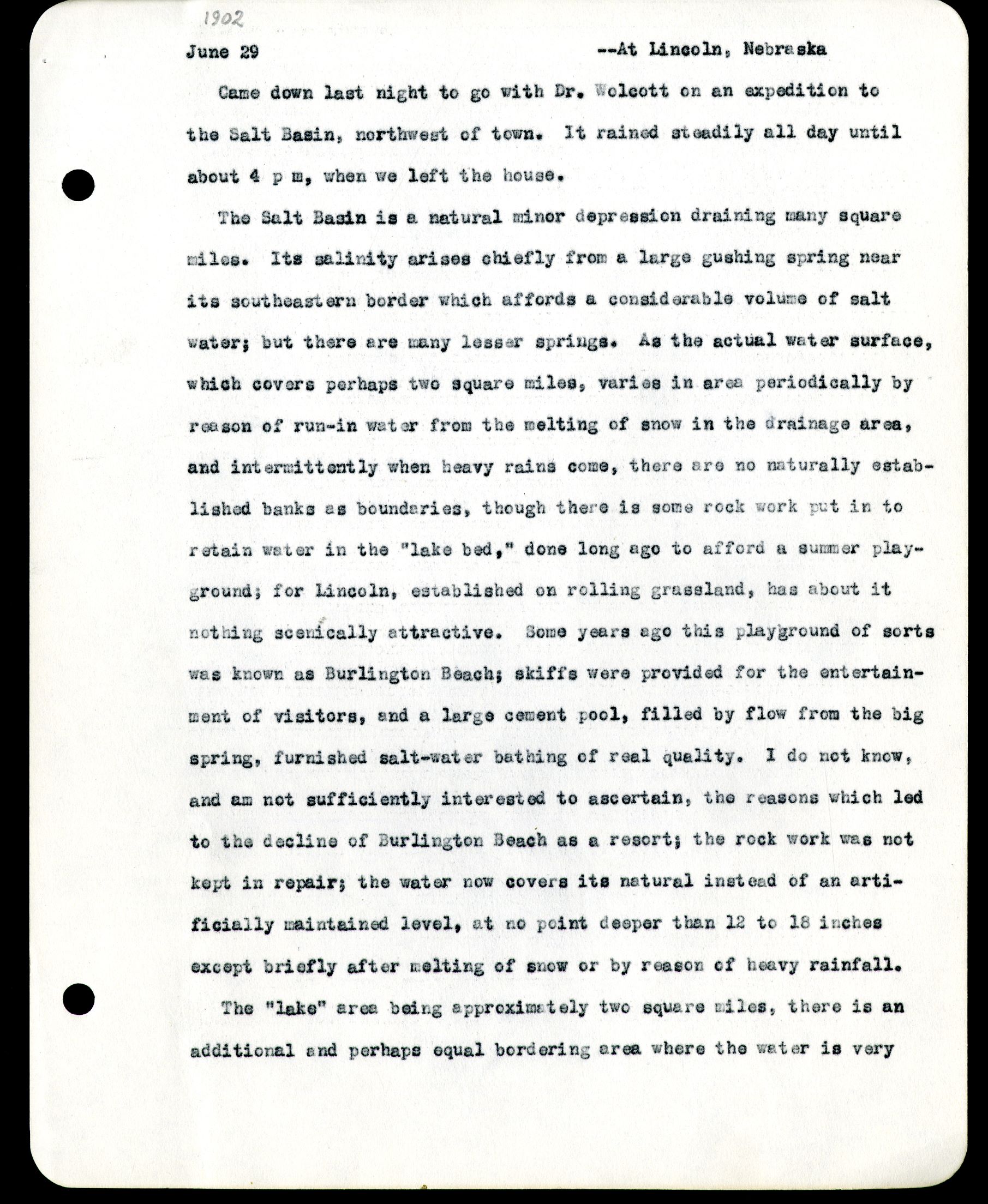June29 - Lincoln, Nebraska Came down last night to go with Dr. Wolcott on an expedition to the Salt Basin, northwest of town. It rained steadily all day until about 4 p m, when we left the house. The Salt Basin is a natural minor depression draining many square miles. Its salinity arises chiefly from a large gushing spring near its southwestern border which affords a considerable volume of salt water; but there are many lesser springs. As the actual water surface, which covers perhaps two square miles, varies in area periodically by reason of run-in water from the melting of snow in the drainage area, and intermittently when heavy rains come, there are no naturally established banks as boundaries, though there is some rock work put in to retain water in the "lake bed," done long ago to afford a summer playground; for Lincoln, established on rolling grassland, has about it nothing scenically attractive. Some years ago this playground of sorts was knowns of Burlington Beach as a resort; the rock work was not kept in repair; the water now covers its natural instead of an artificially maintained level, at no point deeper than 12 to 18 inches except briefly after melting of snow or by reason of heavy rainfall. The "lake" area being approximately two square miles, there is an additional and perhaps equal bordering area where the water is very
