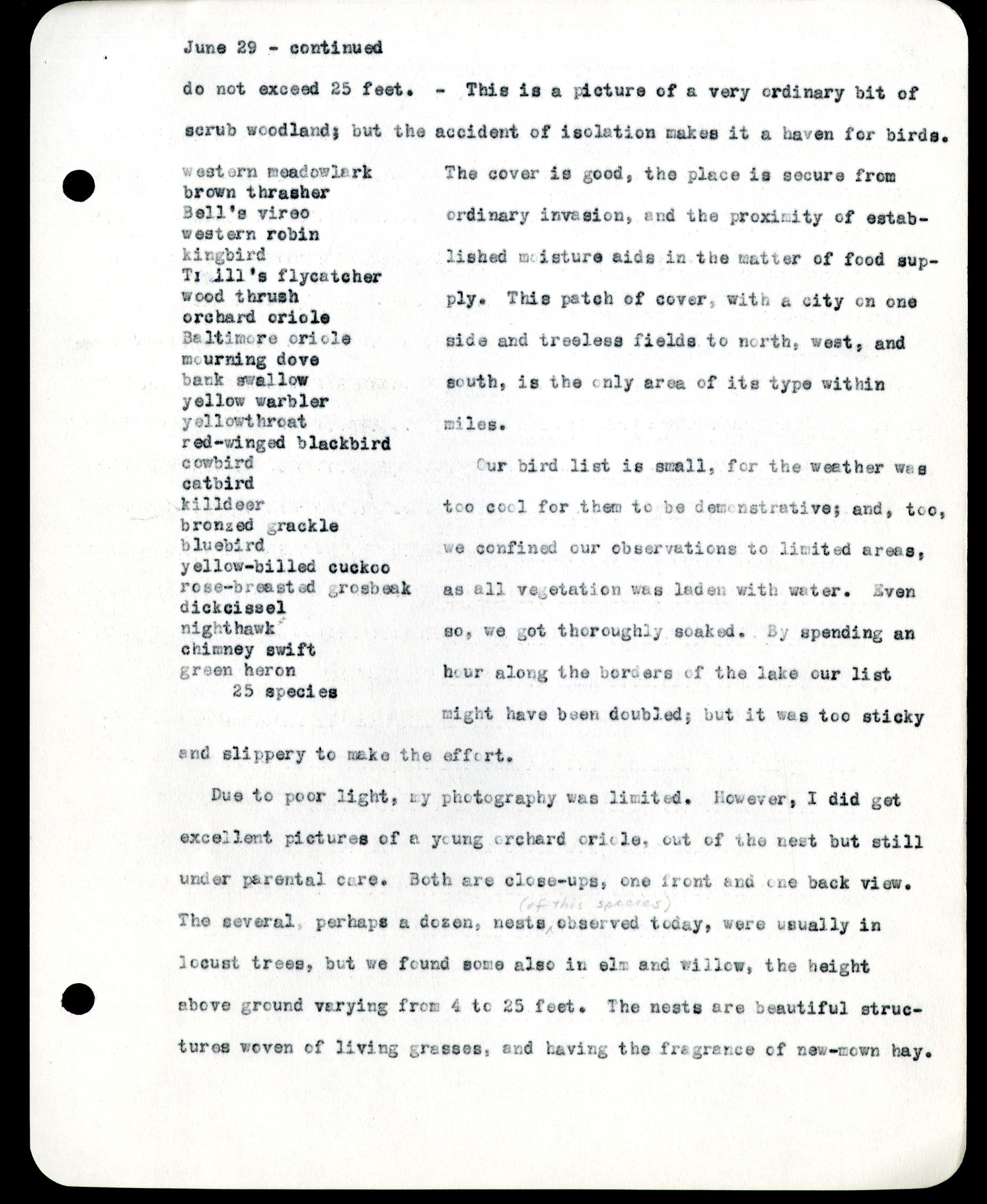 June 29 - continued do not exceed 25 feet. - This is a picture of a very ordinary bit of Shrub woodlands; but the accident of isolation makes it a haven for birds. western meadowlark brown thrasher Bell's vireo western robin kingbird Traill's flycatcher wood thrush orchard oriole Baltimore oriole mourning dove bank swallow yellow warbler yellowthroat red-winged blackbird cowbird catbird killdeer bronzed grackle bluebird yellow-billed cuckoo rose-breasted grosbeak dickcissel nighthawk chimney swift green heron 25 species The cover is good, the place is secure from ordinary invasion, and the proximity of established moisture aids in the matter of food supply. This patch of cover, with a city on one side and treeless fields to north, west, and south, is the only area of its type within miles. Our bird list is small, for the weather was too cool for them to be demonstrative; and, too, we confined our observations to limited areas, as all vegetation was laden with water. Even so, we got thoroughly soaked. By spending an hour among the borders of the lake our list might have been doubled; but it was too sticky and slippery to make the effort. Due to poor light, my photography was limited. However, I did get excellent pictures of a young orchard circle, out of the nest but still under parental care. Both are close-ups, one front and one back view. The several, perhaps a dozen, nests of this species observed today, were usually in locust trees, but we found some also in elm and willow, the height above ground varying from 4 to 25 feet. The nests are beautiful structures woven of living grasses, and having the fragrance of new-mown hay.