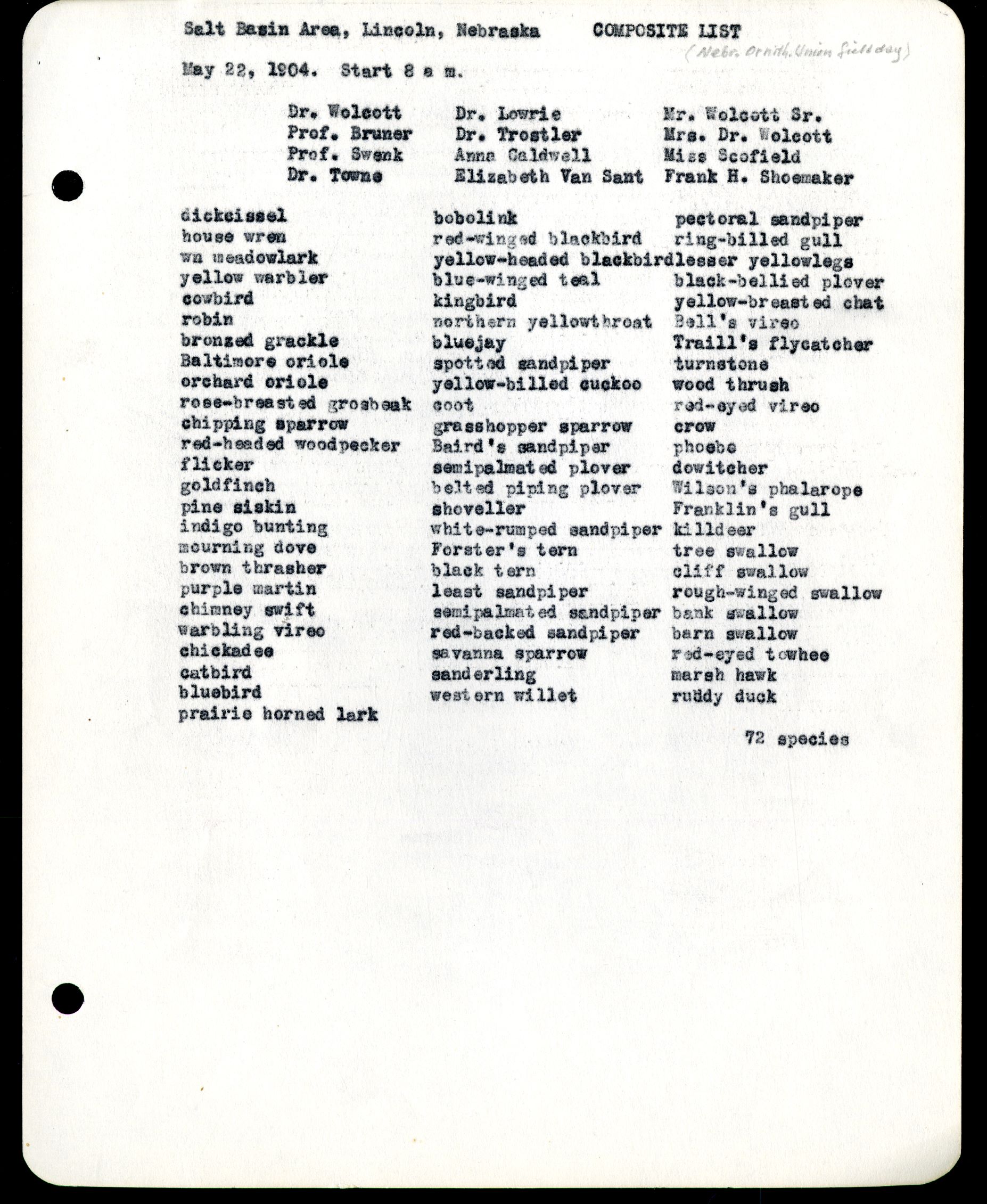 Salt Basin Area, Lincoln, Nebraska COMPOSITE LIST (Nebr. Ornith. Union field day) May 22, 1904. Start 8 a.m. Dr. Wolcott Dr. Lowrie Mr. Wolcott Sr. Prof. Bruner Dr. Torstler Mrs. Dr. Wolcott Prof. Swenk Anna Caldwell Miss Scofield Dr. Towne Elizabeth Van Sant Frank H. Shoemaker dickcissel bobolink pectoral sandpiper house wren red-winged blackbird ring-billed gull wn meadowlark yellow-headed blackbird lesser yellowlegs yellow warbler blue-winged teal black-bellied ployer robin northern yellowthroat Bell's vireo bronzed grackle bluejay Traill's flycatcher Baltimore oriole spotted sandpiper turnstone orchard oriole yellow-billed cuckoo wood thrush rose-breasted gorsbeak coot red-eyed vireo chipping sparrow grasshopper sparrow crow red-headed woodpecker Baird's sandpiper phoebe flicker semipalmated plover dowitcher goldfinch belted piping plover Wilson's phalarope pine siskin shoveller Franklin's gull indigo bunting white-rumped sandpiper killdeer mourning dove Forster's tern tree swallow brown thrasher black tern cliff swallow purple martin least sandpiper rough-winged swallow warbling vireo semipalmated sandpiper bank swallow chickadee savanna sparrow red-eyed towhee catbird sanderling marsh hawk bluebird western willet ruddy duck prairie horned lark 72 species