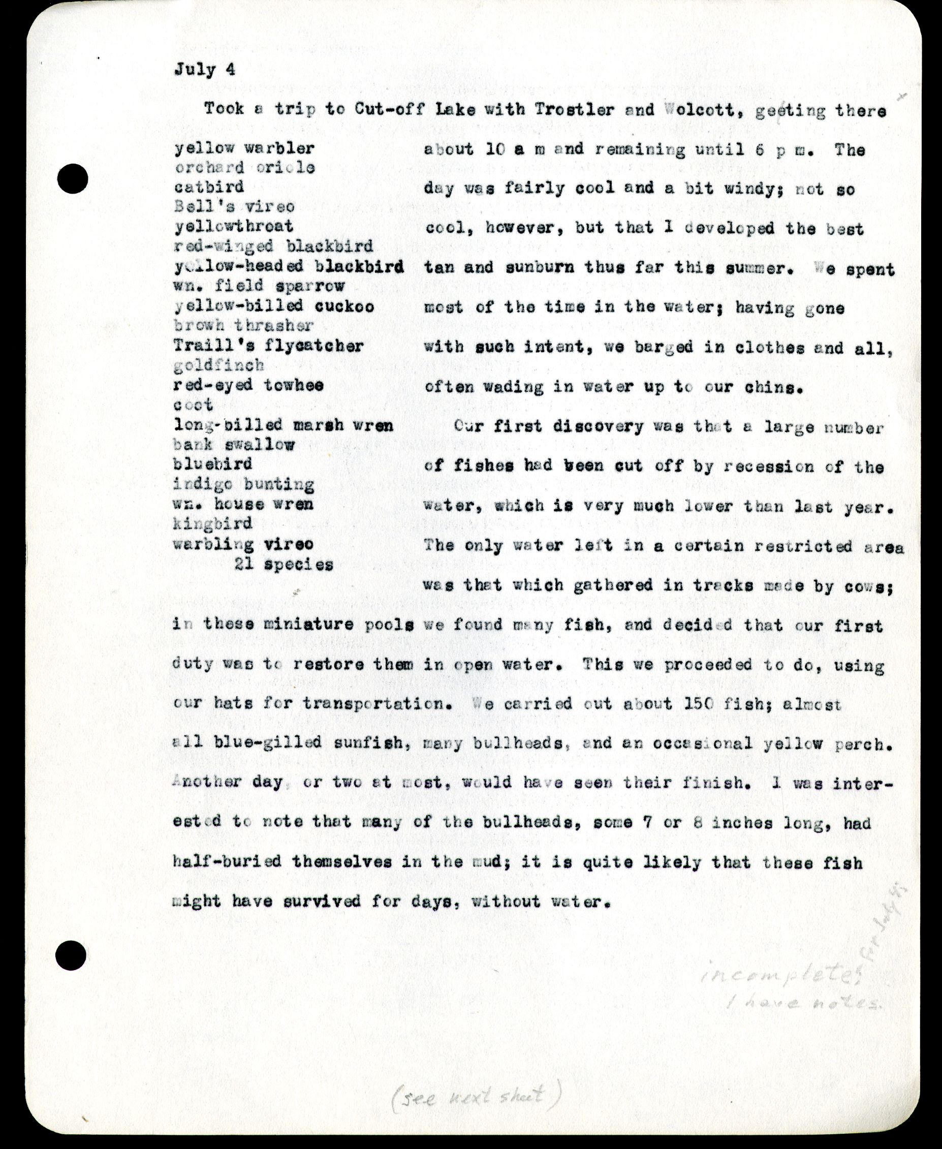 July 4 yellow warbler orchard oriole catbird Bell's vireo yellowthroat red-winged blackbird yellow-headed blackbird wn. field sparrow yellow-billed cukoo brown thrasher Traill's flycatcher goldfinch red-eyed towhee coot long-billed marsh wren bank swallow bluebird indigo bunting wn. house wren kingbird warbling vireo 21 species Took a trip to Cut-off Lake with Trostelr and Wolcott, getting there about 10 a m and remaining until 6 p m. The day was fairly cool and a bit windy; not so cool, however, but that I developed the best tan and sunburn thus far this summer. We spent most of the time in the water; having gone with such intent, we barged in clothes and all, often wading in water up to our chins. Our first discovery was that a large number of fishes had been cut off by recession of the water, which is very much lower than last year. The only water left in a certain restricted area was that which gathered in tracks made by cows; in these miniature pools we found many fish, and decided that our first duty was to restore them in open water. This we proceeded to do, using our hats for transportation. We carried out about 150 fish, almost all blue-gilled sunfish, many bullheads, some 7 or 8 inches long, had half-buried themselves in the mud; it is quite likely that these fish might have survived for days, without water.