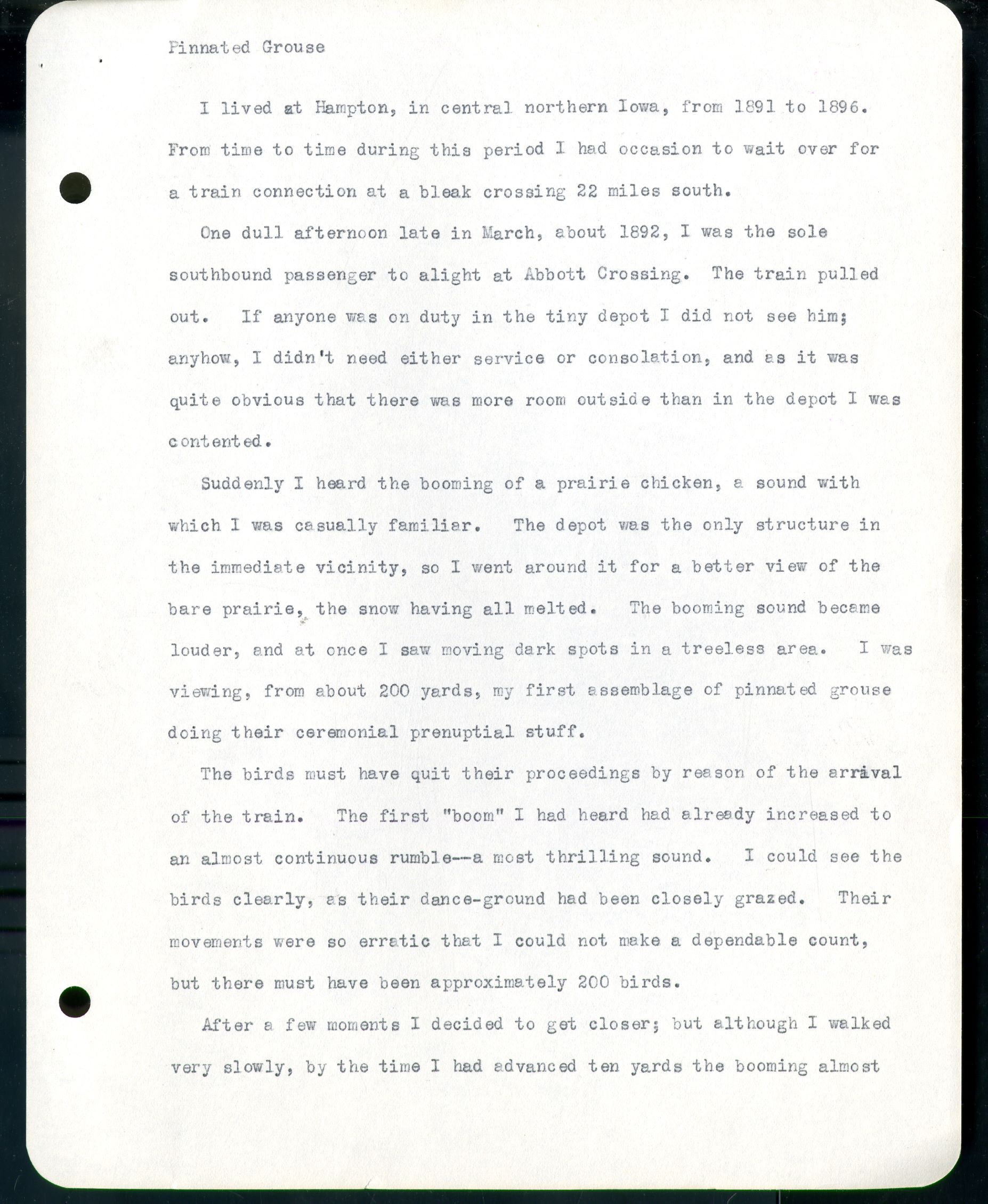 Pinnated grouse I lived in Hampton, in central northern Iowa, from 1891 to 1896. From time to time during this period I had occasion to wait over for a train connection at a bleak crossing 22 miles south. One dull afternoon late in March, about 1892, I was the sole eastbound passenger to alight at Abbott Crossing. The train pulled out. If anyone was on duty in the tiny depot I did not see him; anyhow, I didn't need either service or consolation, and as it was quite obvious that there was more room outside than in the depot I was contented. Suddenly I heard the booming of a prairie chicken, a sound with which I was casually familiar. The depot was the only structure in the immediate vicinity, so I went around it for a better view of the bare prairie, the snow having all melted. The booming sound became louder, and at once I saw moving dark spots in a treeless area. I was viewing, from about 200 yards, my first assemblage of pinnated grouse doing their ceremonial prenuptial stuff. The birds must have quit their proceedings by reason of the arrival of the train. The first "boom" I had heard had already increased to an almost continuous rumble - a most thrilling sound. I could see the birds clearly, as their dance-ground had been closely grazed. Their movements were so erratic that I could not make a dependable count, but there must have been approximately 200 birds. After a few moments I decided to get close; but although I walked very slowly, by the time I had advanced ten yards the booming almost
