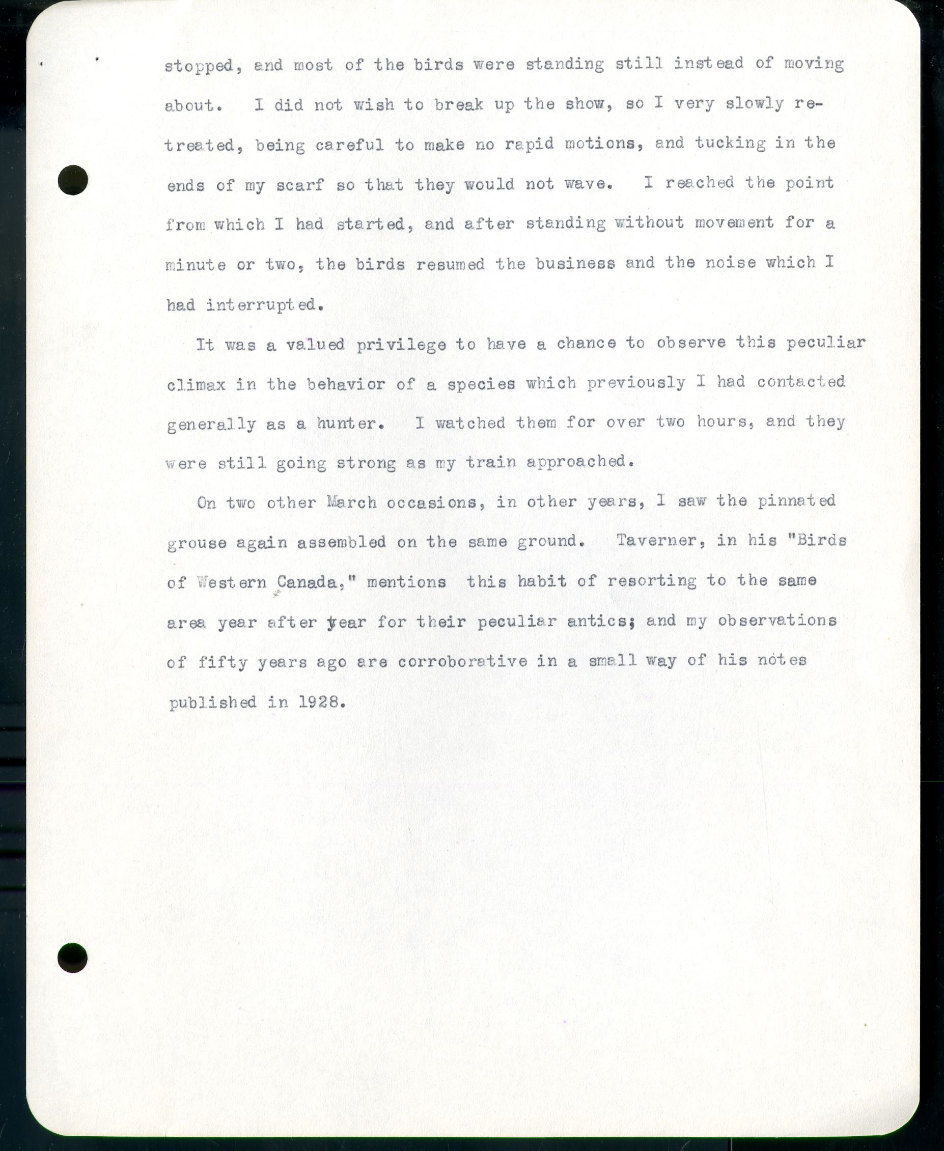 stopped, and most of the birds were standing still instead of moving about. I did not wish to break up the show, so I very slowly retreated, being careful to make no rapid motions, and tucking in the ends of my scarf so that they would not wave. I reached the point from which I had started, and after standing without movement for a minute or two, the birds resumed the business and the noise which I had interrupted. It was a valued privilege to have a chance to observe this particular climax in the behavior of a species which previously I had contacted generally as a hunter. I watched them for over two hours, and they were still going strong as my train approached. On two other March occasions, in other years, I saw the pinnated grouse again assembled on the same ground. Taverner, in his "Birds of Western Canada," mentions this habit of resorting to the same area year after year for their peculiar antics; and my observations of fifty years ago are corroborative in a small way of his notes published in 1928.